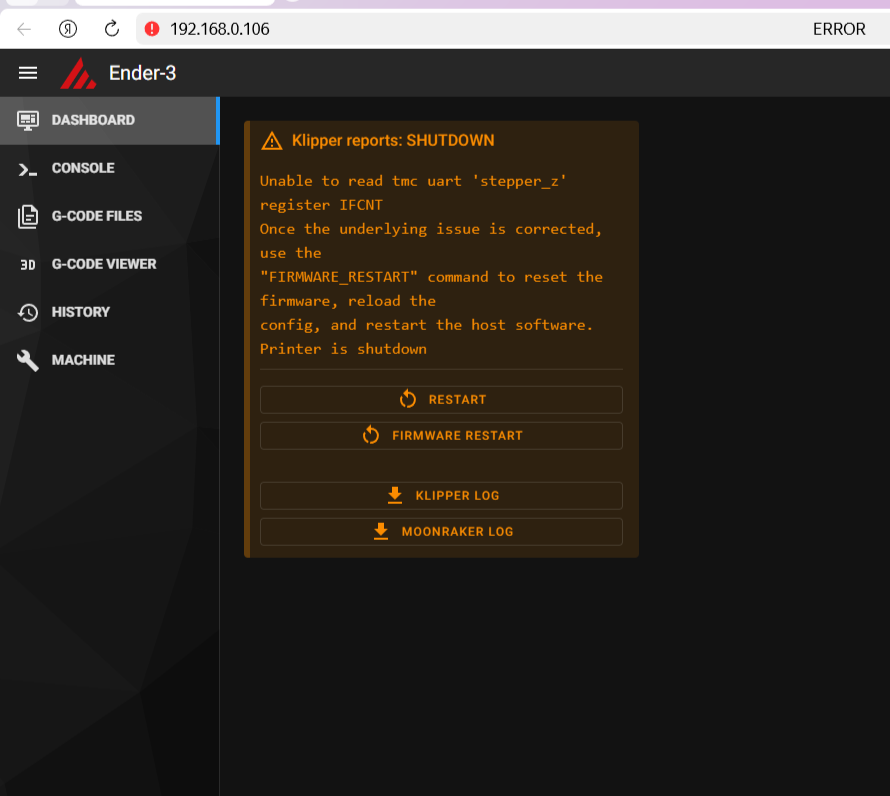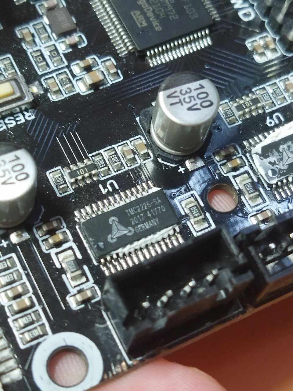 Добрый день, прошу помощи. Купил полгода назад btt skr mini e3 v2.1, установил на ender-3 Marlin на эту плату. Принтер работал, оси двигались, печатал, НО писал каждый раз TMC CONNECTION ERROR. В Marlin-е был выбран тип драйверов tmc2209. Отмечу, что skr e3 v2.1 должна поставляться с ними, а не с другими драйверами. Сейчас перепрошил на klipper (в комментариях прикреплю printer.cfg) . Все хорошо работает, запускаю autohome выдает ошибку: Klipper reports: SHUTDOWN Unable to read tmc uart 'stepper_z' register IFCNT Once the underlying issue is corrected, use the "FIRMWARE_RESTART" command to reset the firmware, reload the config, and restart the host software. Printer is shutdown . После этого стал разбираться, какая-то плата не такая что ли. Во-первых, стоит микроконтроллер GD, а не STM, но это ладно, во-вторых, радиатор на драйверах другой и, В-ТРЕТЬИХ, драйвера стоят TMC2225. В printer.cfg указаны tmc2209 и по поиску в интернете написано, что должны быть 2209. Пробовал менять в printer.cfg типы драйверов на tmc2208, далее убирал uart_address, в общем, плясал с бубном. Ничего, что я попробовал не помогло. Интересно, почему же на marlin-е с указанием tmc2209 принтер работал, а на klipper-е нет. Складывается, такое ощущение, что мне продали какую-то паленую материнку, сделанную из того, что было на заводе. В общем, пожалуйста, подскажите, что делать, посмотрите мой printer.cfg. Может быть, перепаять драйвер? Только по Z, кстати, ошибку выдает. Думаю, что придется покупать новую плату.Прикрепляю фото: