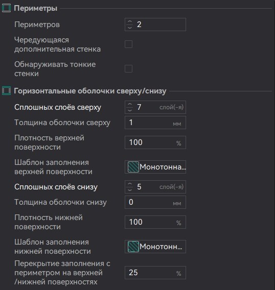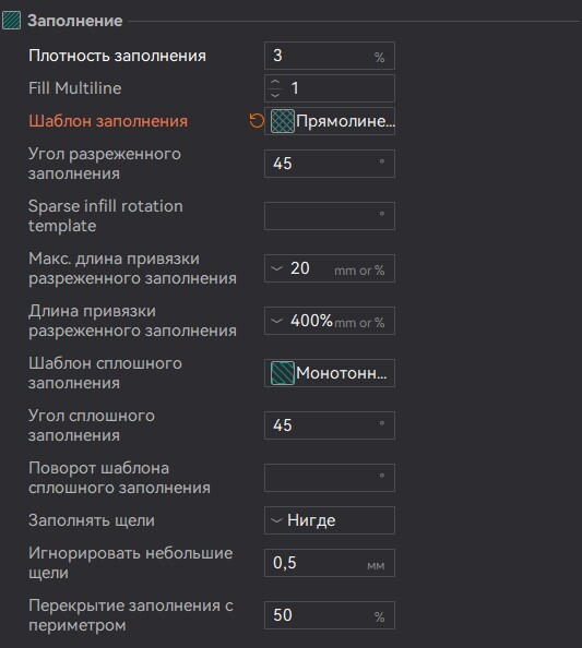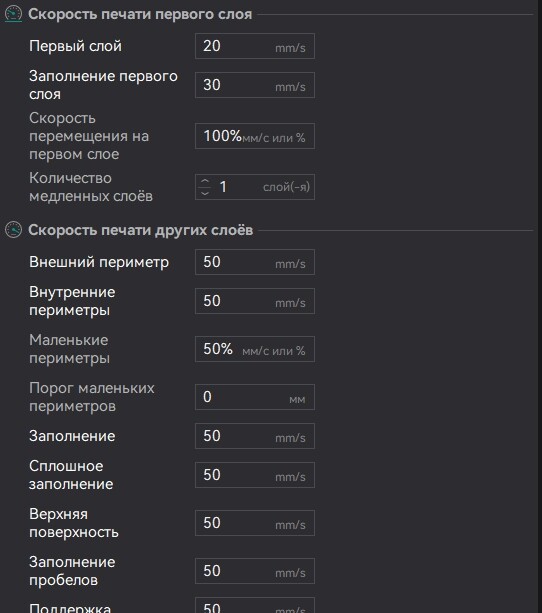 У заполнения также есть доп. параметр, начиная со слоя 600+ он печатает 7% заполненияСкорости тоже все порезаны до предела (по-моему, конечно)