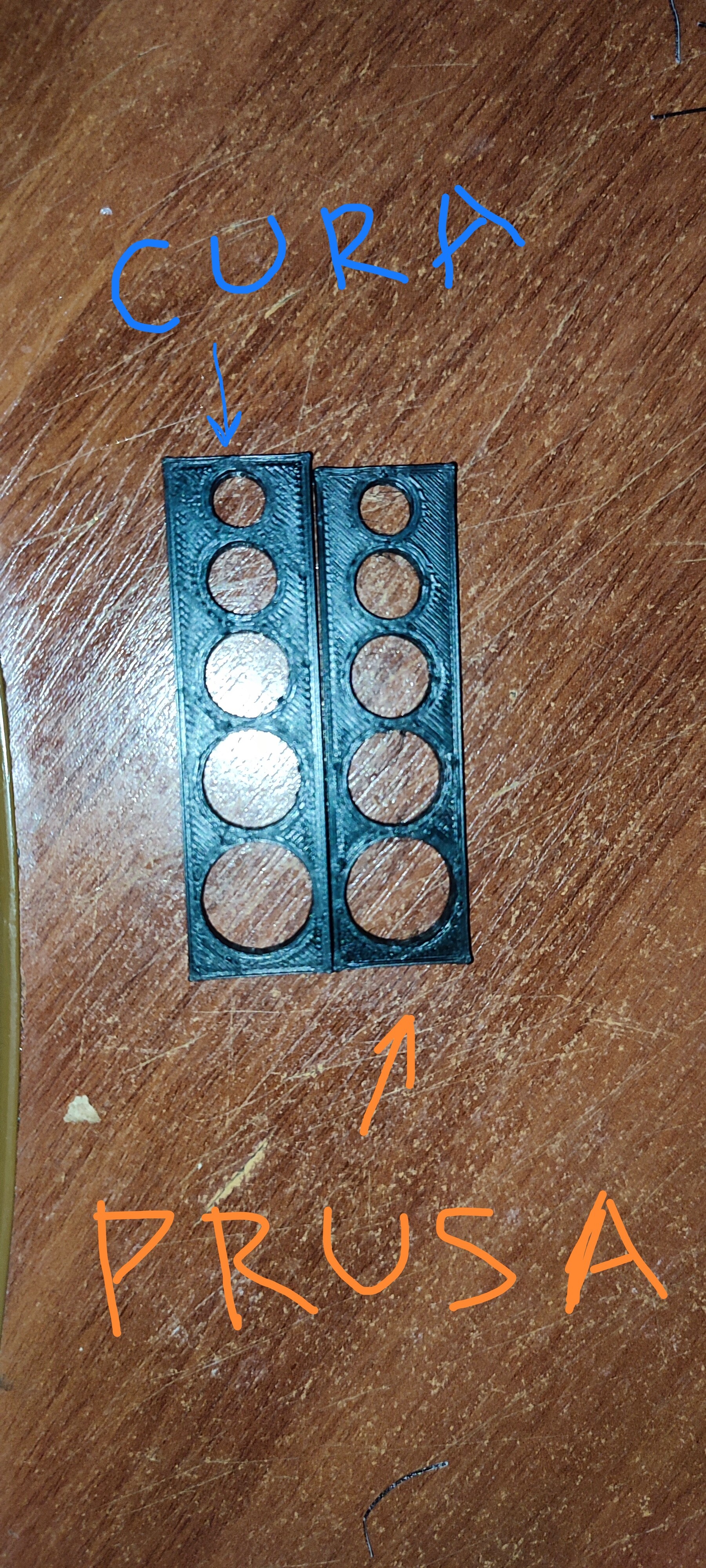 Вчера же, собрал на коленке простую калибровочную модель. Пластинка с размерами 20*75 и отверстиями с определенным калибром от 8 до 16мм в диаметре, с шагом 2мм. Нарезал в двух слайсерах и вот что у меня вышло: