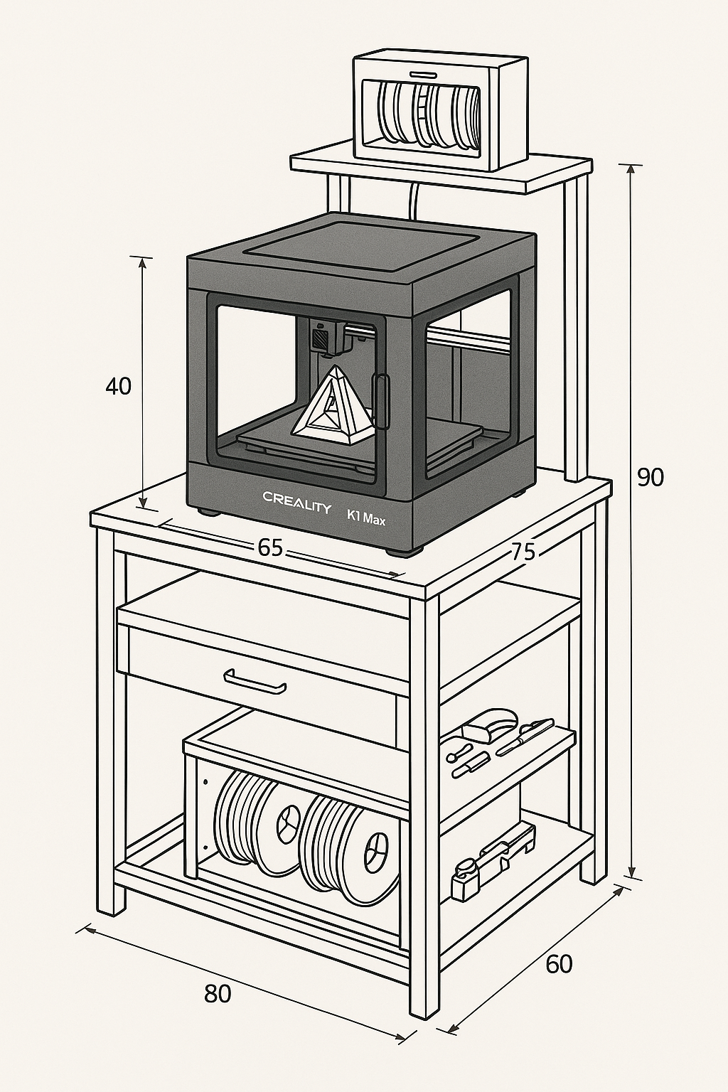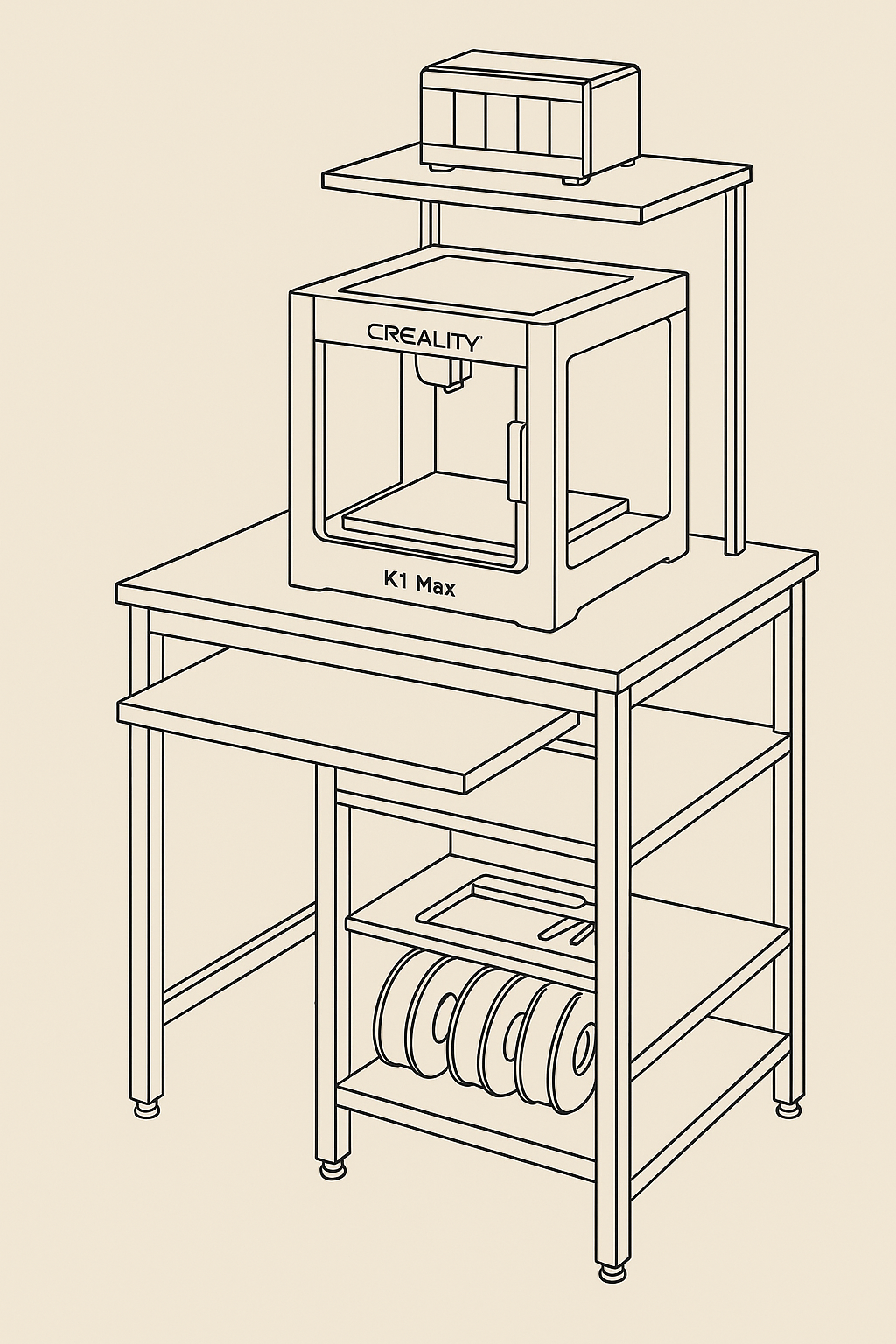 В связи с этим у меня возник вопрос о приобретении хорошего такого добротного верстака под него, на который можно и принтер поставить, и катушки по полкам разложить, и AMS/CFS/что-то там S над принтером поставить, и чтобы дополнительная выдвижная столешница была для работ с деталями и не только. И чтобы всё это дело было шириной около метра (ограниченное пространство лоджии).