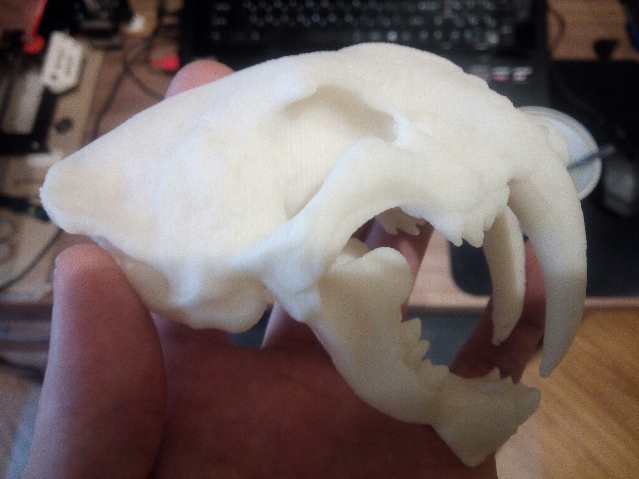 вот печать абс, низ челюсти вышел без проблем:модель располагалась вот так:фото на пла к сожалению не сохранилось, только зуб (увы плохо видно на фото), и то тут уже постарался свести косяки к минимуму, напечатав слоем 0.075, на слое 0.1 и 0.2 разными соплами вообще борода получаласьво многих нависающих местах череп вышел с дефектами.