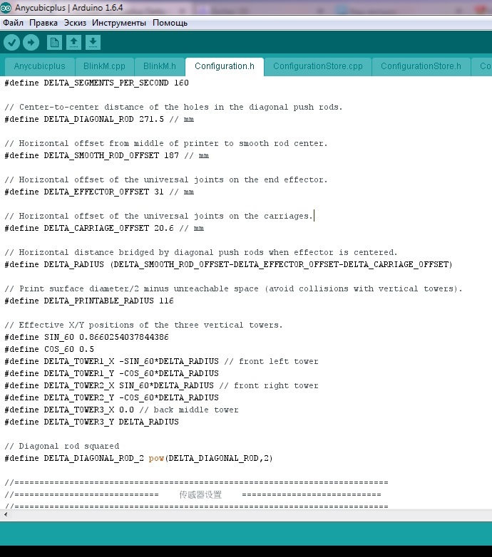 Вот результат расчетаВот часть прошивки, куда вроде как нужно внести изменения С параметром DELTA_DIAGONAL_ROD и homed height все понятно. Что касается Дельта радиуса, то в прошивке запись '#define DELTA_RADIUS (DELTA_SMOOTH_ROD_OFFSET-DELTA_EFFECTOR_OFFSET-DELTA_CARRIAGE_OFFSET)' я понял как 187-31-20,6 = 135,4 мм. Какой параметр изменить, чтобы получилось 135,90 мм? Куда вносить данные по endstop corrections и tower position angle corrections?