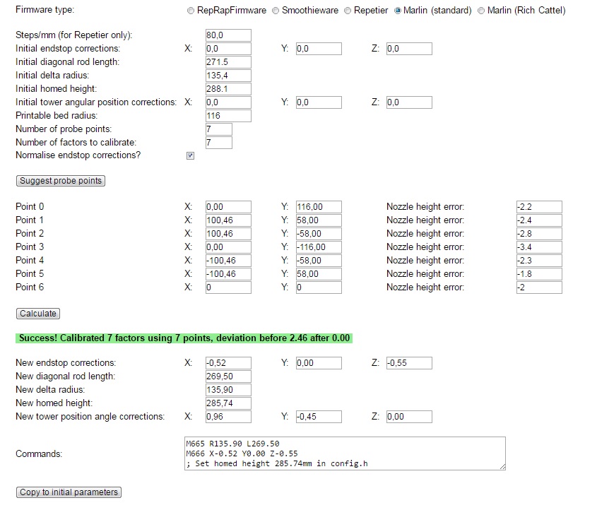 Решил откалибровать принтер Anycubiс Kossel (плата Trigorilla, mega2560, прошивка Marlin) с помощью калькулятора http://escher3d.com/pages/wizards/wizarddelta.php
