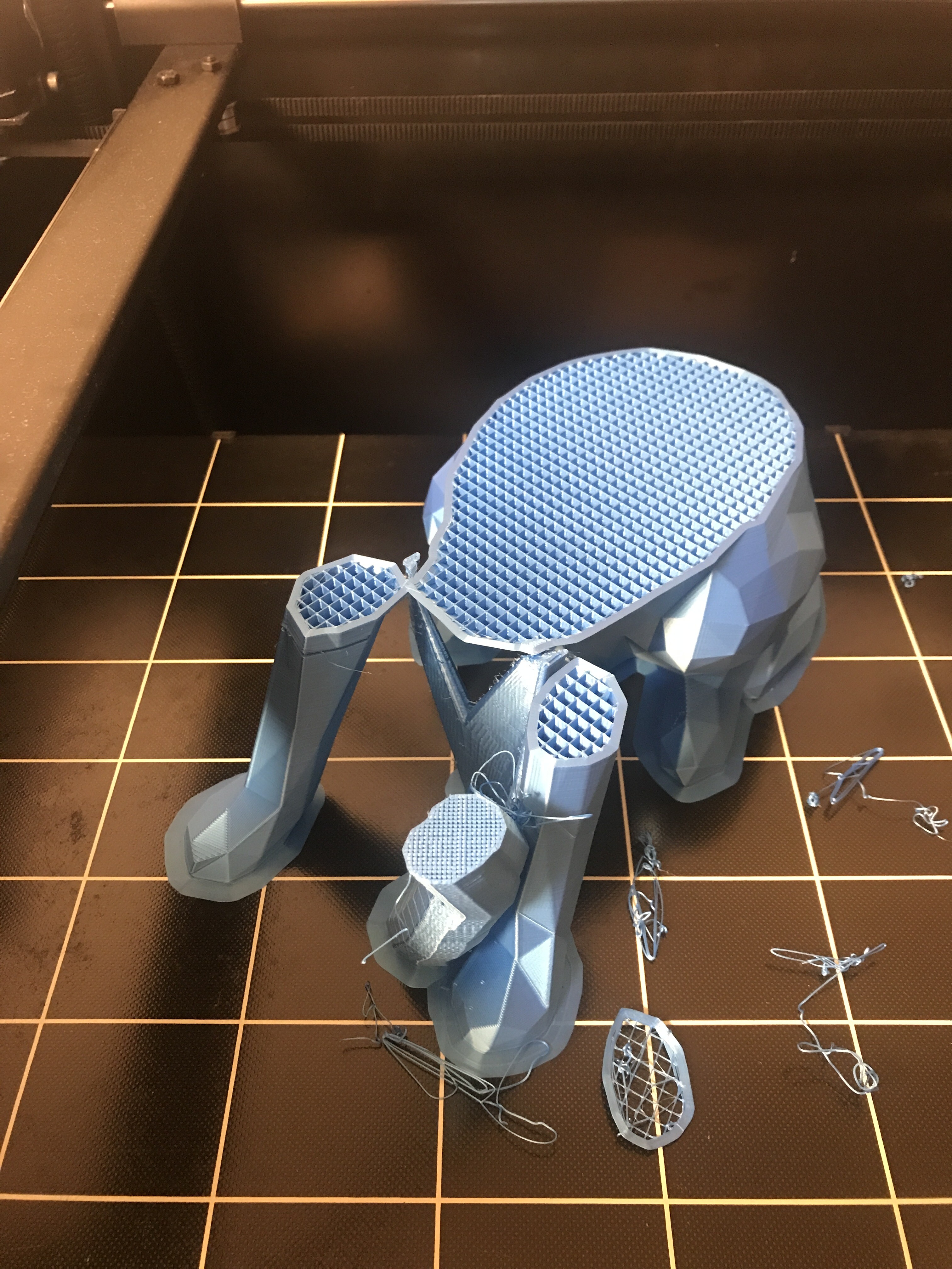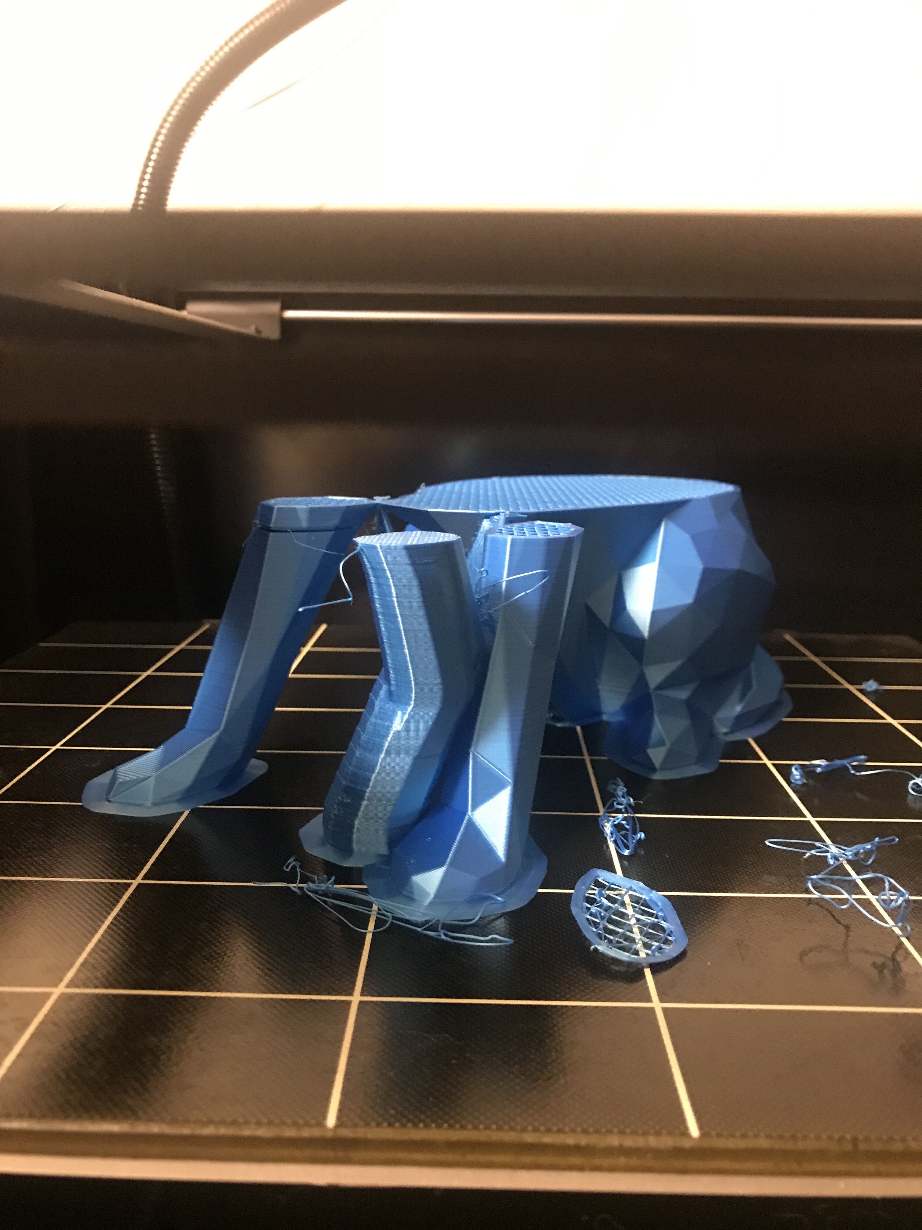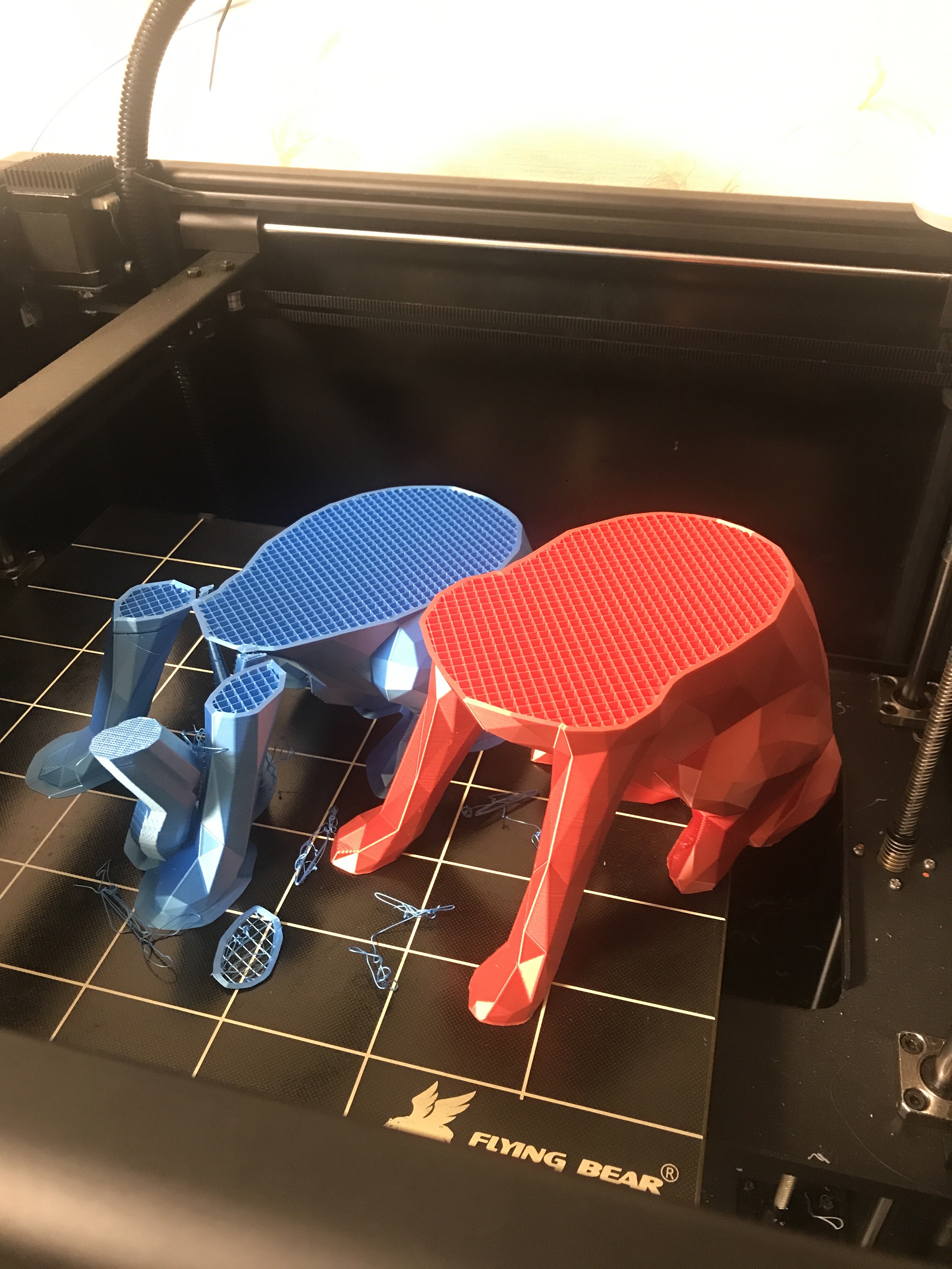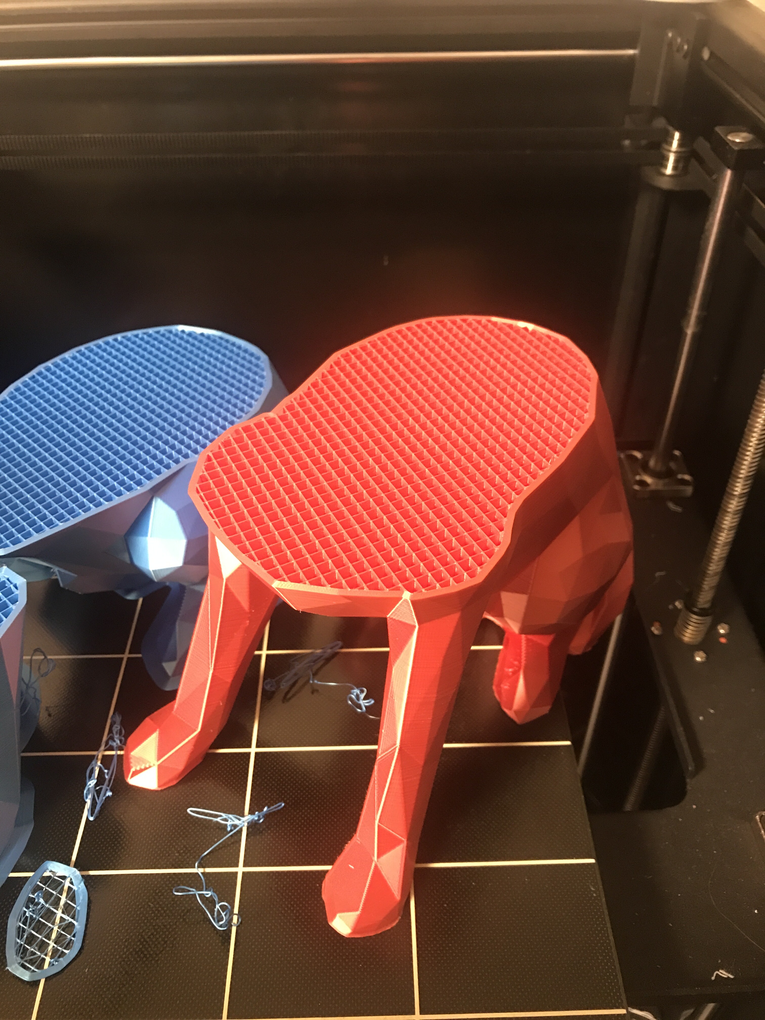 Всем привет. Помогите найти причину моих неудачных попыток распечатать большое детали. Решил распечатать большую собаку низко полигональную из оставшегося пластика на катушке шелковистого красного PLA. Около 700гр. Сразу скажу что до этого я печатал пластиком с этой катушки эту же собаку только высотой где то около 120 см печать была успешной. Так вот запустил на печать большую собаку, печать понеслась и печаталось около суток может больше я уже напомню. Переодически навещаю принтер и наблюдаю что приблизительно на половине печати принтер схватил пробку, пластик не выходит, моторы работают. Я выключил принтер и забил со злости на эту печать. Прошёл месяц и я отошёл от стресса и начал печатать этим же красным пла пластиком другую зверушку не особо больших размеров. Печатал раза 4 и раза 4 ловил пробку на разных слоях но эти проблемы вылезали через 2-3 часа печати. Плюнув на все заменил пластик на другой, тоже блесчий пла только фирма noulei зелёный и фиолетовый. И печать пошла проблем не наблюдалось. Потом я решил вернутся к собаке и распечатать ее потратив весь 1 кг синего pla пластика. Запустил на печать и понеслось, все было идеально, стол откалиброван, количество шагов мотора экструдера откалибровано, пид откалиброван, печаталось очень качественно просто заглядение, прошли около полтора суток и опять какая та пробка хз( как думаете что это такое. У меня мысль может это пластик какой то неправильный или что? Красный и синий пла на скриншоте фирма. Экструдер вулкано. У меня лишь мысли что это может быть некачественный pla который забивает сопло. По идее нужно ещё раз распечатать что то большое мб ту же собаку но с другого пла другого производителя.