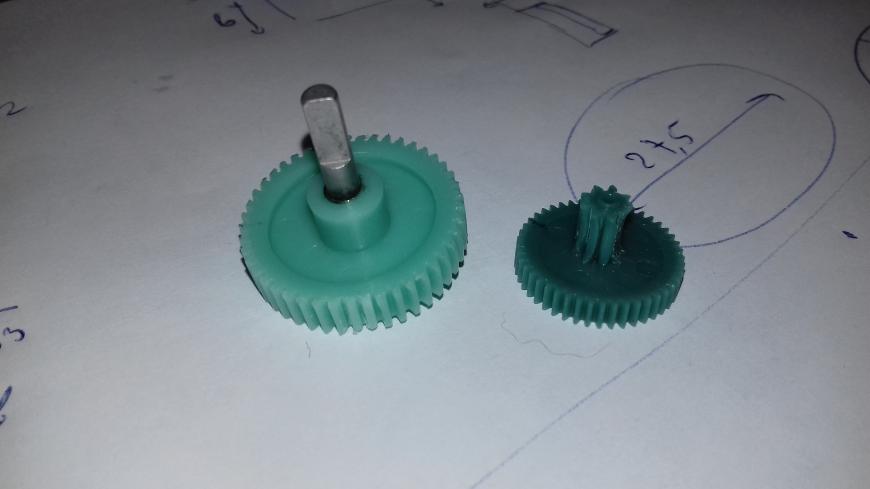 Для ориентировки по размерам - большая шестерня диаметром 27.5 мм. У второй чуть меньшего диаметра 45 зубцов высотой 0.9мм.