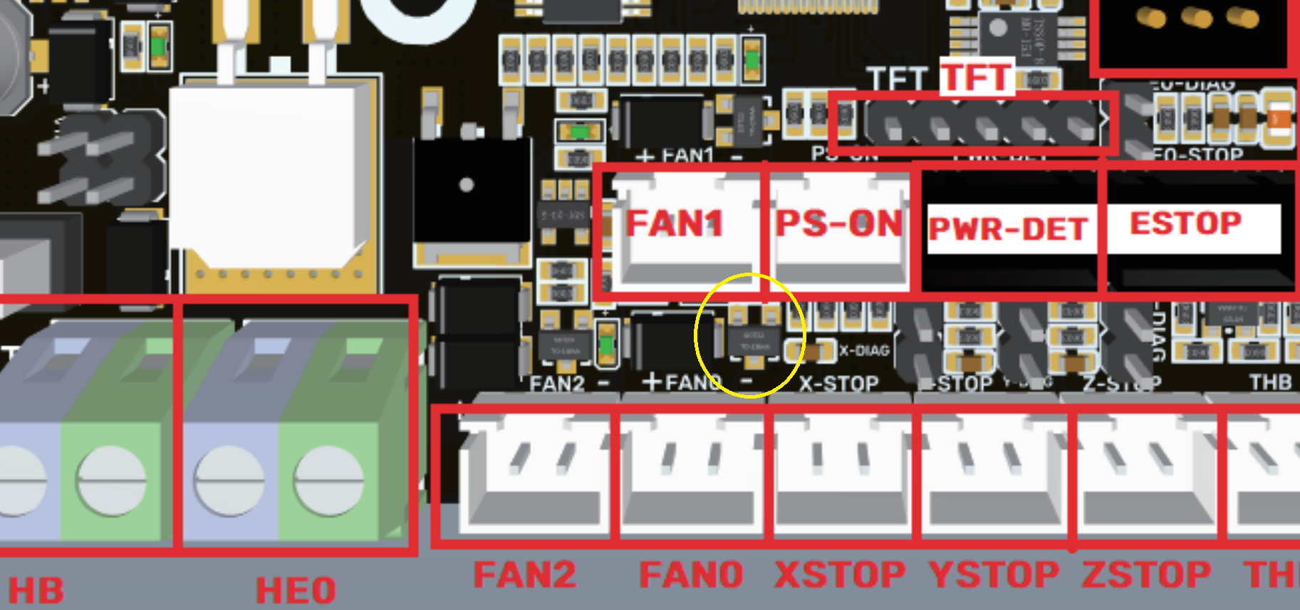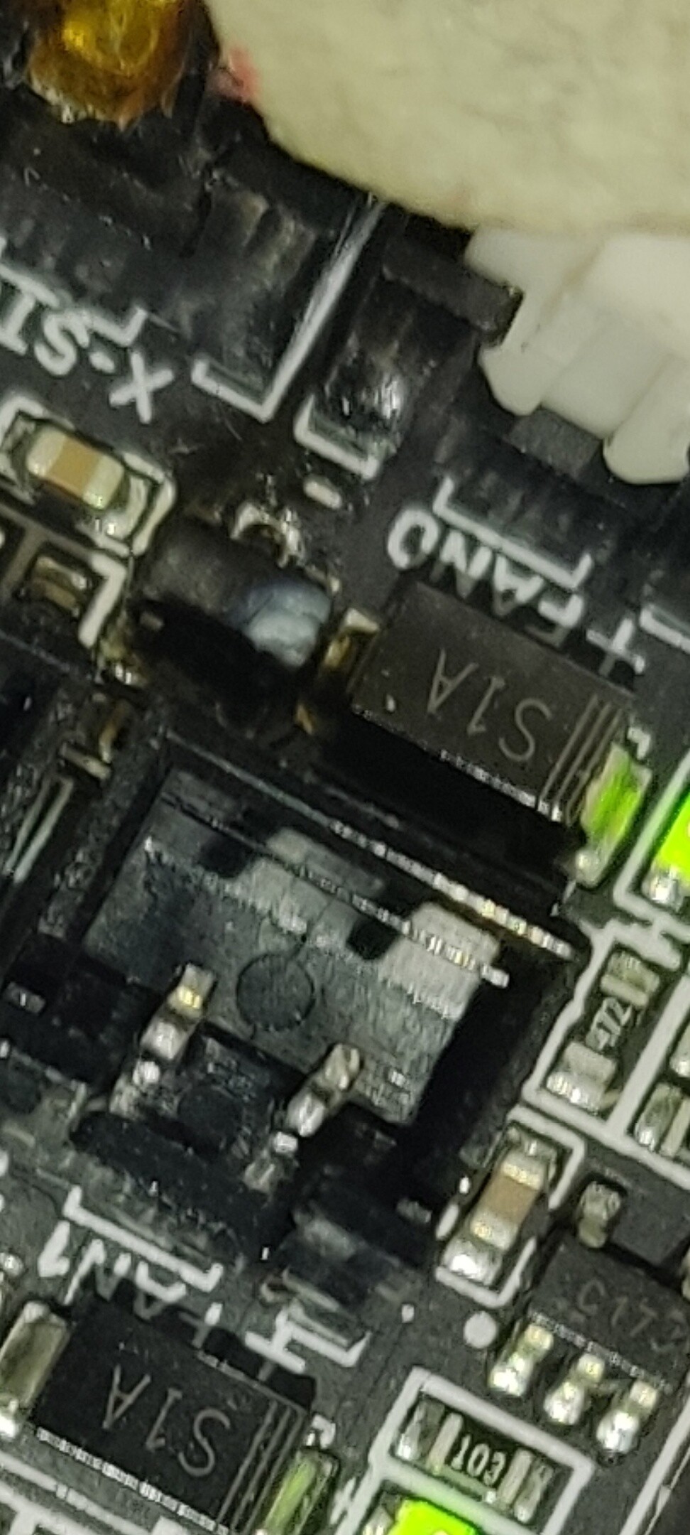 Добрый день. Решил поставить на свой Tronxy xy новыую плату. При установке столкнулся с кучей прблем. Вот вроде все собрал начал настраивать и запускать первые печати, все было нормально. Но в один момент вспыхнул компонент на плате. Плата работает дальше и даже печатает, вентиляторы работают с виду пробем нету. Не поможете разобраться что за компонент и за что он отвечает ?