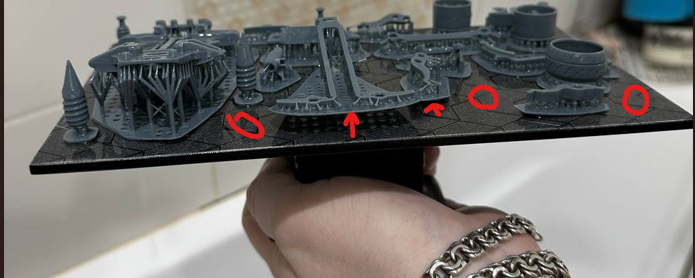 Ну ладно, всё равно планировал печатать ещё другие детали. Добавил то, что не отпечаталось с первого раза. И тут меня ждал сюрприз. Так же отвалилась часть деталей, только уже больше по количеству и новые (которые в первый раз отвалились в этот раз напечатались без проблем). На некоторых деталях первые слои как бы вздыбились а изделие пошло дугой.