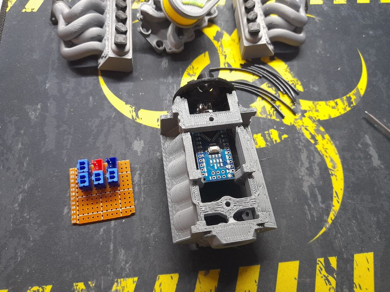 Вся основная развязка электрики будет в двигателе, помимо разъемов для соединения в одну цепь ног, рук, головы и дополнительной подсветки, так же тут будет Arduino Nano и разъемы подключения сервоприводов. Постарался сделать так, чтобы при прошивке не надо было все, каждый раз, разбирать. На корпусе фильтра добавил светящееся лого Print Product.