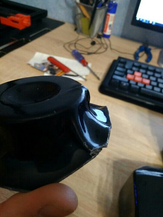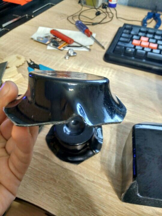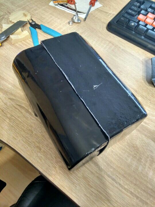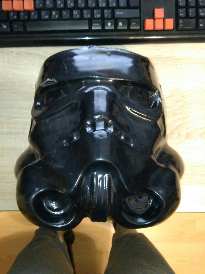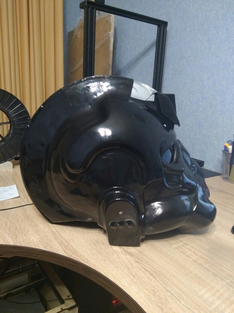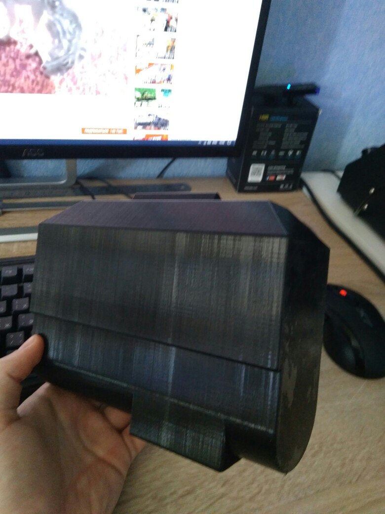 Детали спины и груди были сделаны не плохо, а вот шлем и нагрудная коробка выглядели ужасно, перекошенная лицевая маска и не аккуратно обрезанный короб.В общем шлем я как мог собрал и склеил, а короб управления решил смоделировать и напечатать на 3D принтере. Моделировал в программе 123D Design семейства Autodesk, измерил детали, которые у меня были и подсмотрел в интернете как все должно выглядеть.После моделирования напечатал все детали,обработал наждачной бумагой, покрыл грунтом и покрасил в соответствующие цвета. От шлема к нагрудной коробке идут два пластиковых шланга и для удобства переноски шлема заказчик попросил сделать так чтобы шланги отсоединялись. Так как лицевая маска сделана из очень тонкого пластика и буквально рвется в некоторых местах я решил смоделировать разборный конектор в месте соединения шлангов с коробом,а концы соединения с шлемом надежно закрепить и лишний раз не трогать. В итоге вот что получилось.