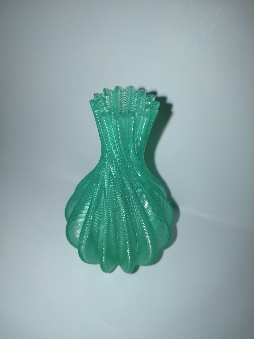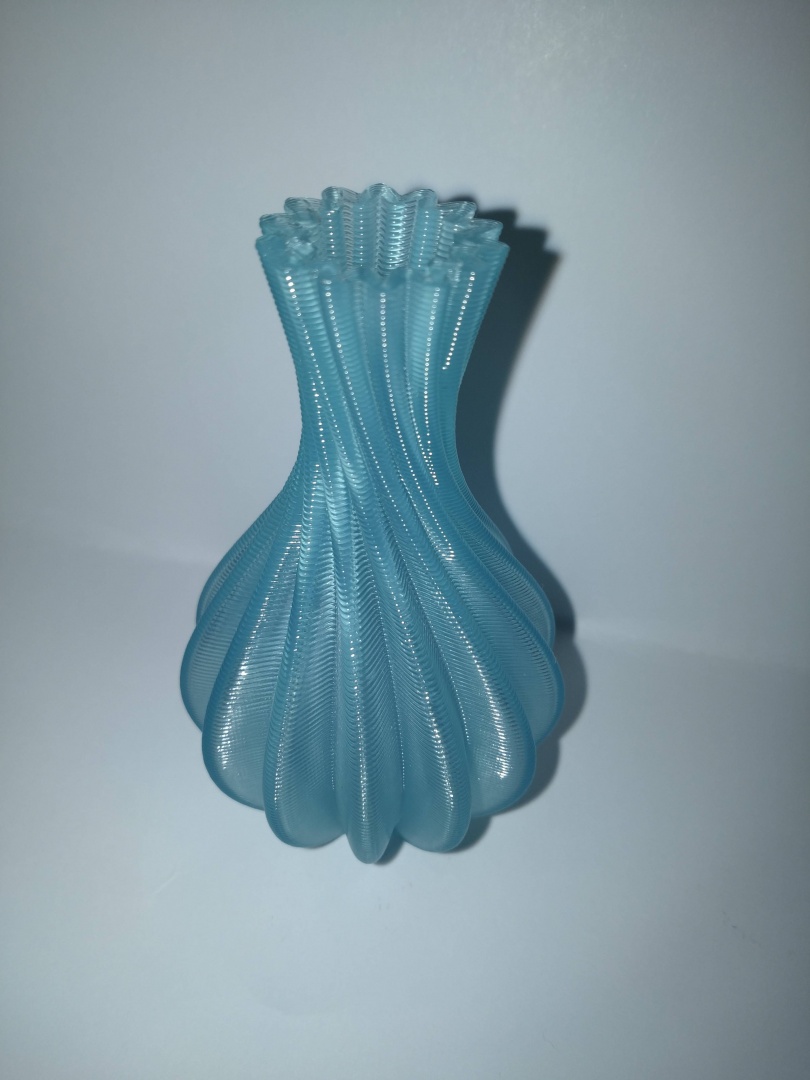 Печаталось на 4-й прюше, сопло 1 мм, высота слоя 0.5, ширина 1, , температура 240 (первый слой)/230 (все остальные), стол 80, скорость 30, с опцией снижения скорости для небольших слоев. Высота вазы 7.5 см, время печати 37 минут.