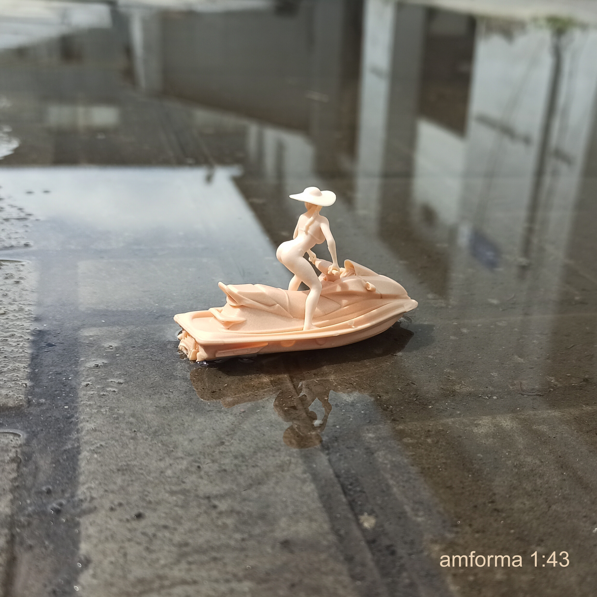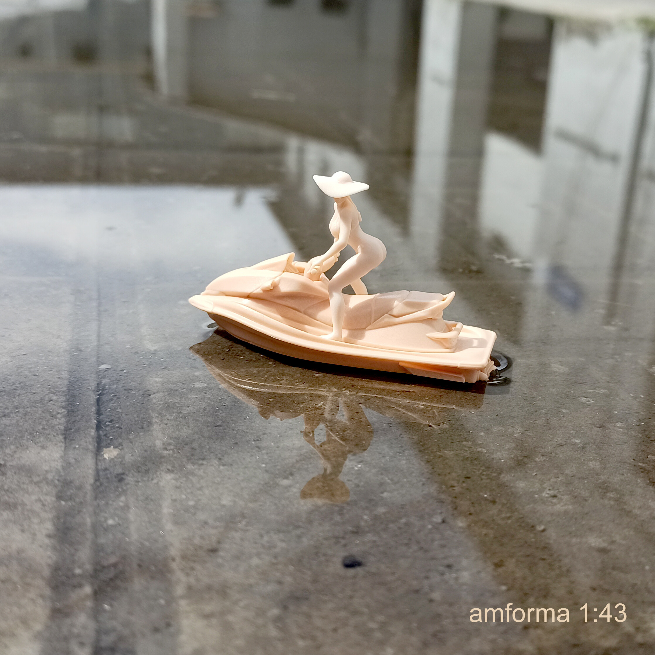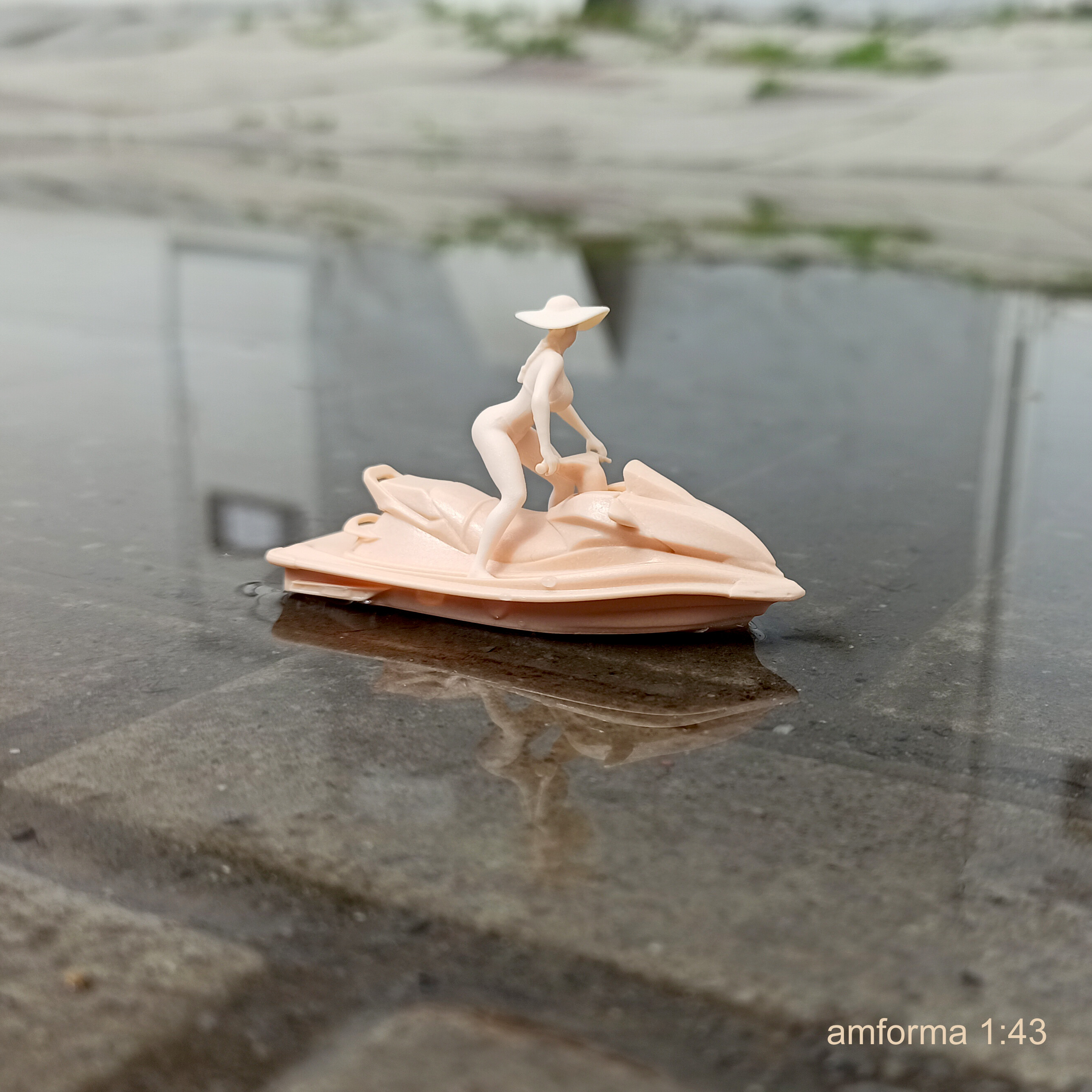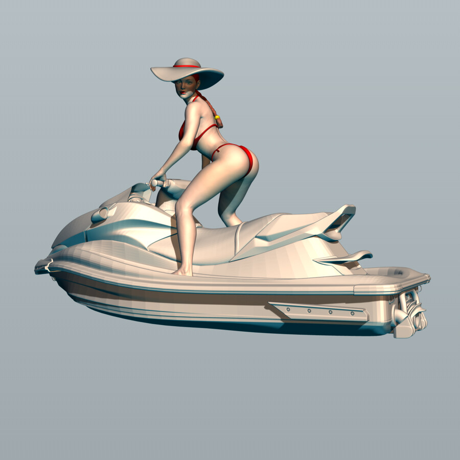 Композиция состоит из 3х частей: Гидроцикл, руль, девушка. Руль отдельно, чтобы была возможность вариаций поз отдыхающих. Планируется не менее пяти разных моделей туловищ.