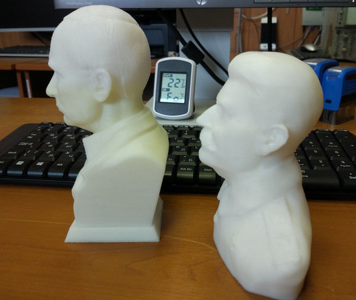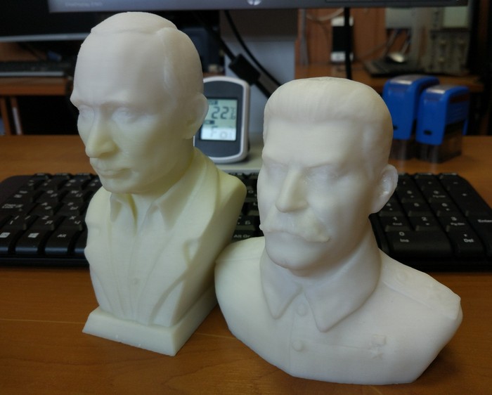 Напечатал на днях два бюста на рабочий стол. Модели нашел в интернетах, полистирол. На одной жёлтая полоса— это пластик оказался не очень качественным...