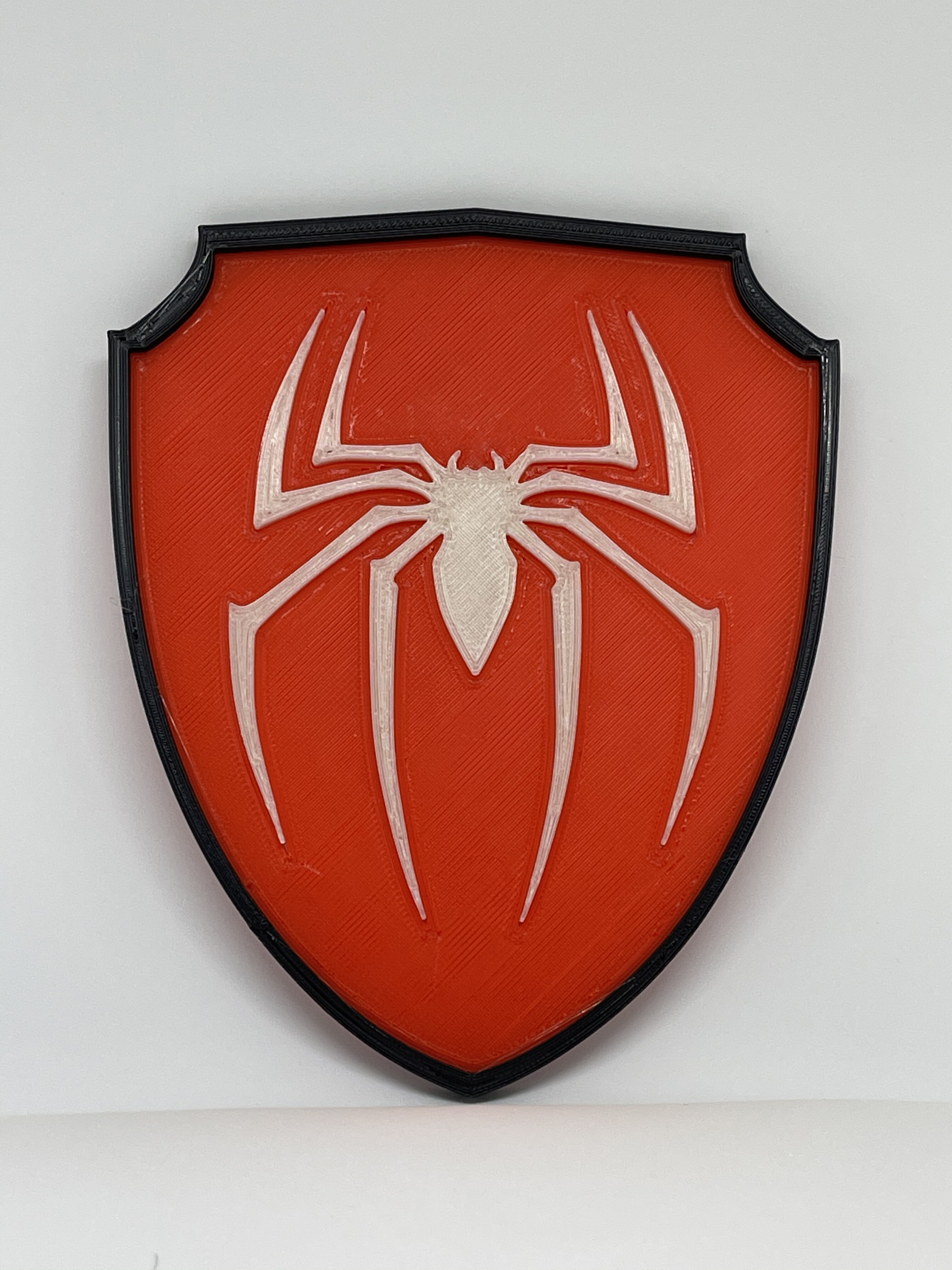 Когда сын увидел всё это безобразие, то срочно заказал себе "значок человека паука на стену над кроватью". Посидел, подумал, нарисовал. Состоит из трёх деталей, встают плотно. Склейки не потребовалось. Хотя можно было бы пройтись сзади ручкой.