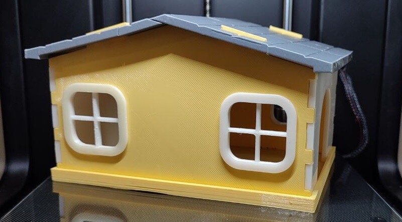 Если будут вопросы как печатать отдельные части и размещать их на столе - пишите, отвечу. Поддержки при печати не требуются. Перед печатью рекомендую изучить пропускные возможности проходов в клетке, чтобы потом не собирать по частям домик внутри нее. В общем масштабируйте!