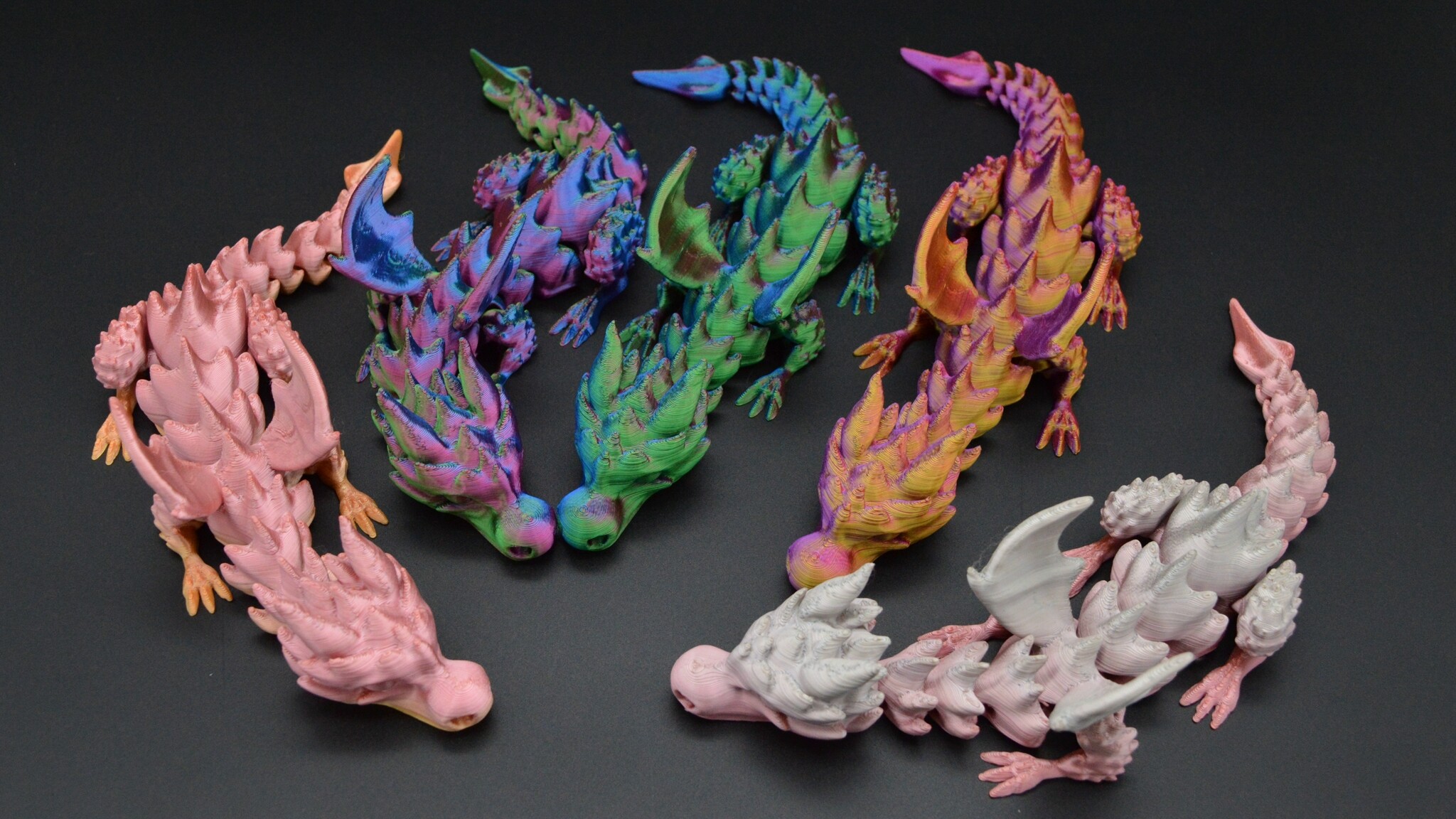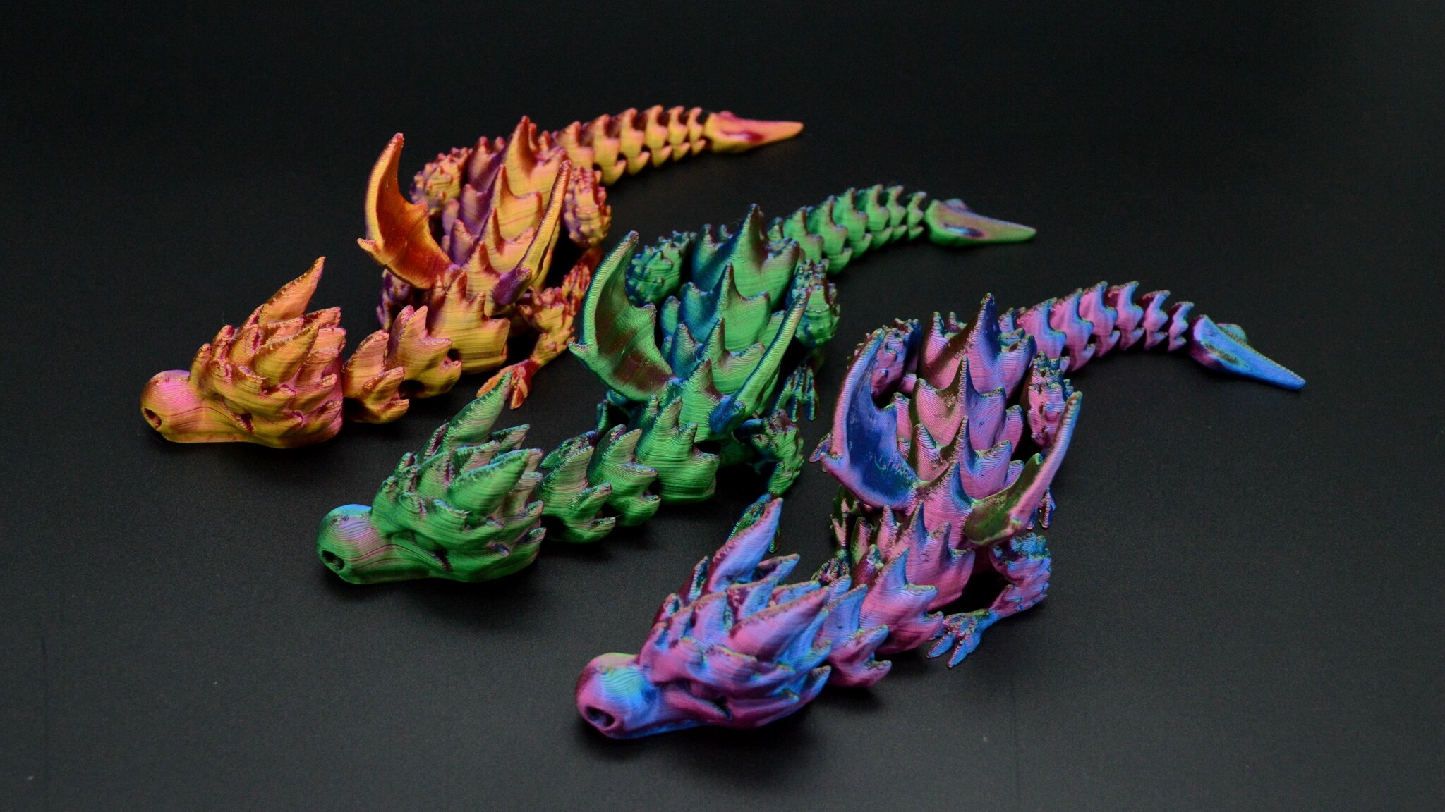 Продолжаю тему сегментных игрушек. На этот раз решил сделать еще одного маленького дракончика. У дракончика все части подвижные (кроме крылышек), печатается легко без поддержек. Печатал PLA-шелк трехцветный и PLA-шелк радужный - в таком исполнении смотрятся очень эффектно.