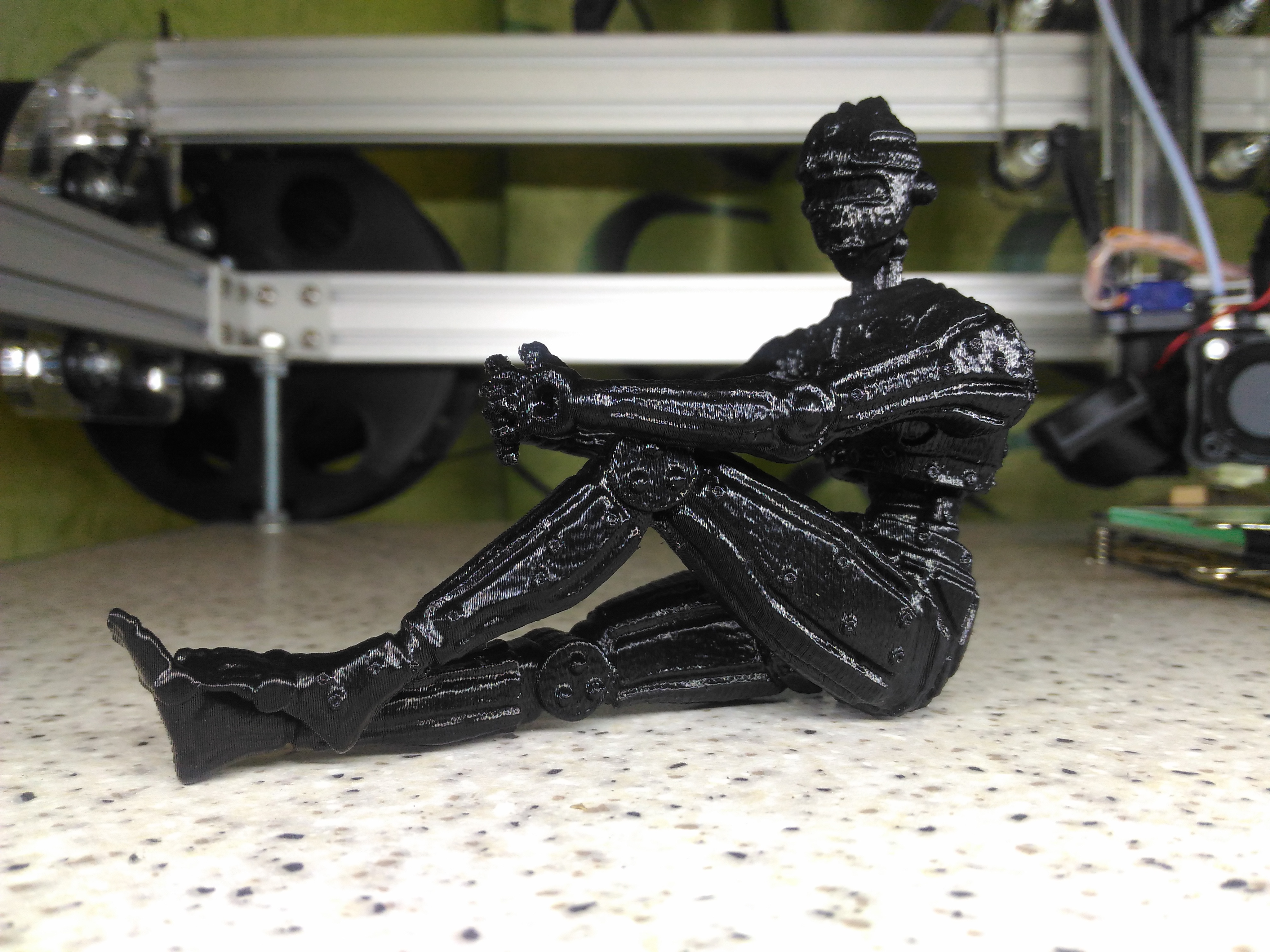 6 часов печати ABS (BF), сопло 0.4, слой 0.24, печатал на спине, и то 12м пластика ушло, несколько поддержек отклеилось от стола, но сильно не повлияло (макушку приклеил)