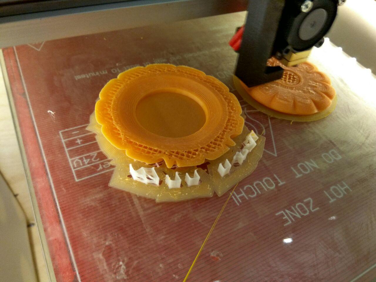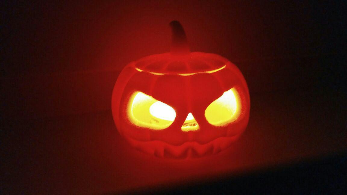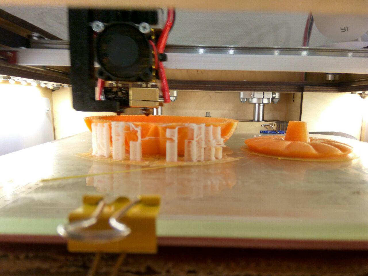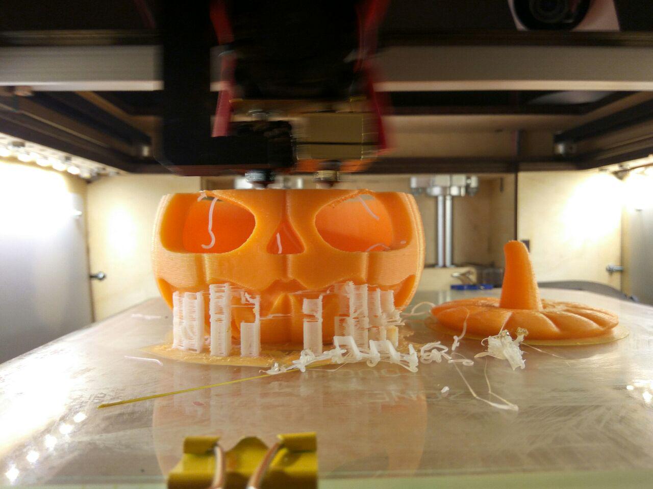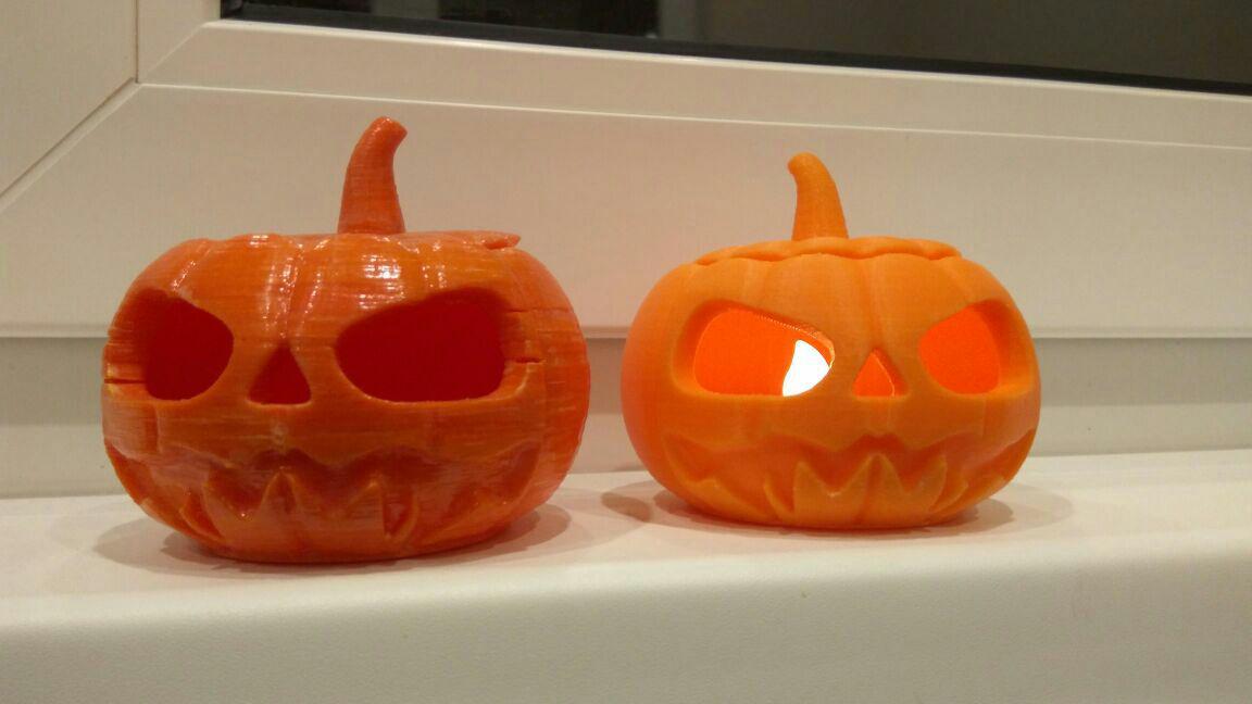 В начале все было хорошо. Но потом кура оказывается настроила поддержек в воздухе и там где глаза, они просто начали падать на дно.Хотя, надо отдтать должное пластику, все напечаталось хорошо. Можно было бы и без поддержек совсем сделать.Сопло 0,6 слой 0,2.Слева прошлогодняя тыква напечатанная на пруше год назад пластиком ABS - косомвент. В процессе начала трескаться и после печати была обработана ABS соком.Вот собственно и всё. Можно отмечать праздник. Всех с хэллоуином! ;)
