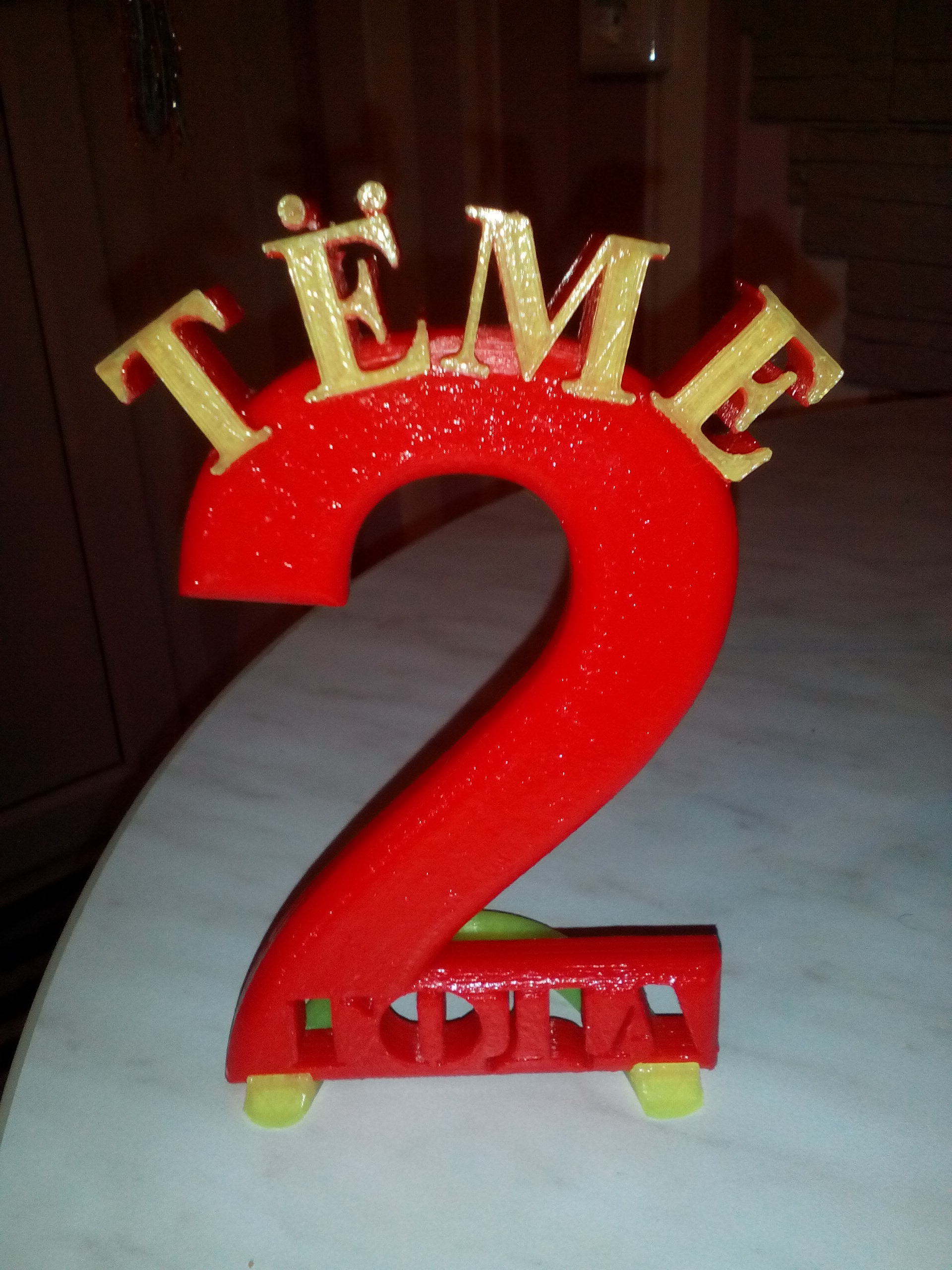 Подарил знакомому на день рождения сына, изготовил на reprap с подменой цвета на ходу, подставка отдельно приклеена, мехобработка 500 камнем с задиркой и последующим 2 сек. купанием в дихлорэтане, в итоге получилось равномерно шершавая поверхность , в конце покрыта матовым лаком.[IMG]