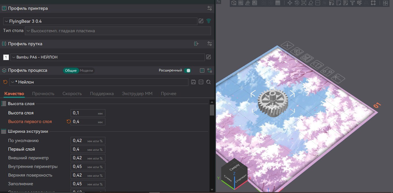 После кого как круг напечатан не снимая его начинаем печать нейлоном. Заранее указав в настройках печати на 1 слой 0.4мм. Температуру стола понизил до 90 градусов. (При повышенной температуре адгезия может ухудшится)
