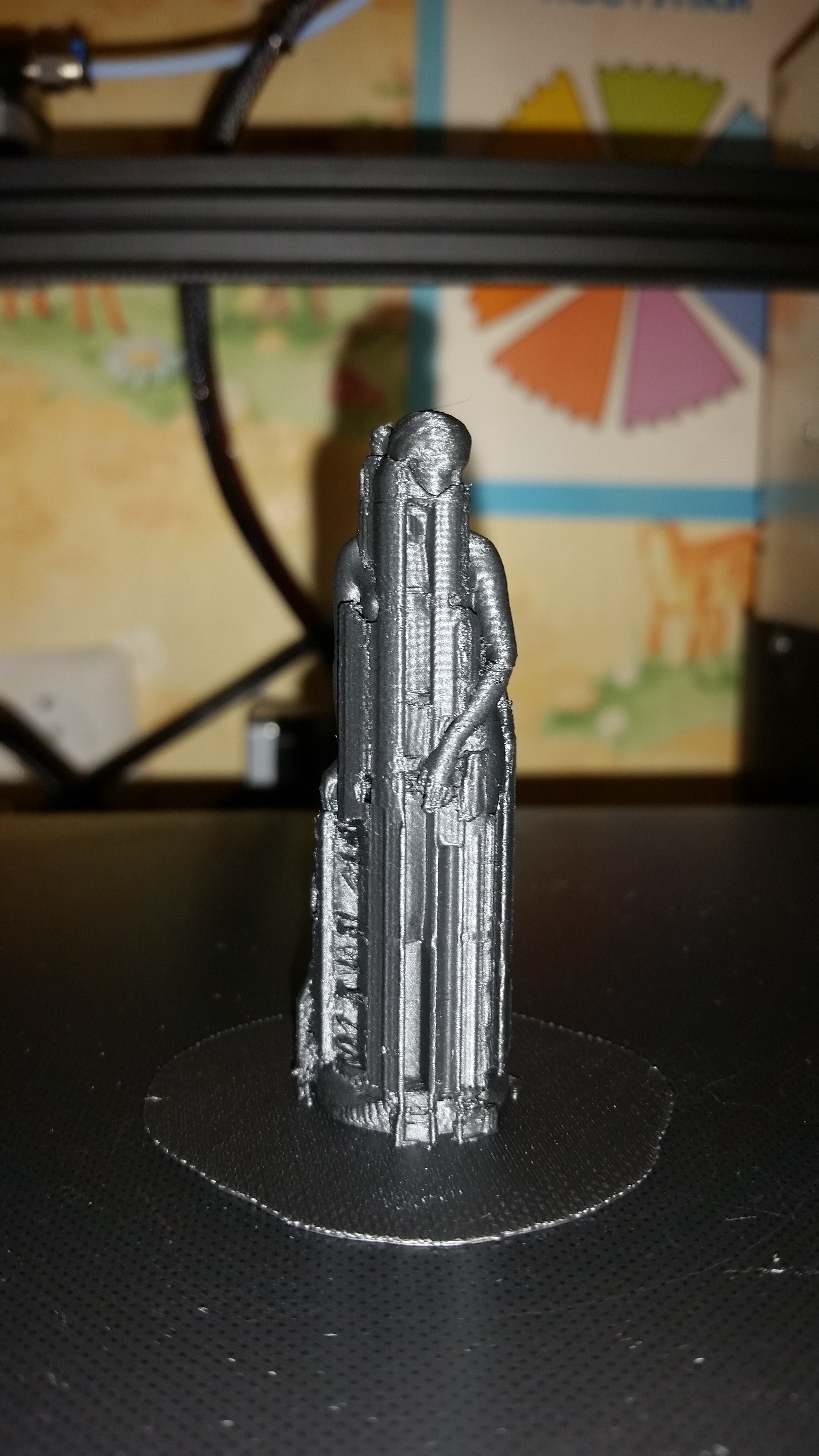 В ходе печати непонятно чем сопло цепляло поддержку, а от одной ветви начиналась печать левой руки, думал либо не пропечатается, либо оторвет, но нет, все нормально с рукой. Поддержка удалилась легко, но на ногах, а точнее между ними, было много "соплей", но они, опять же, легко удалились, практически стряхнулись.