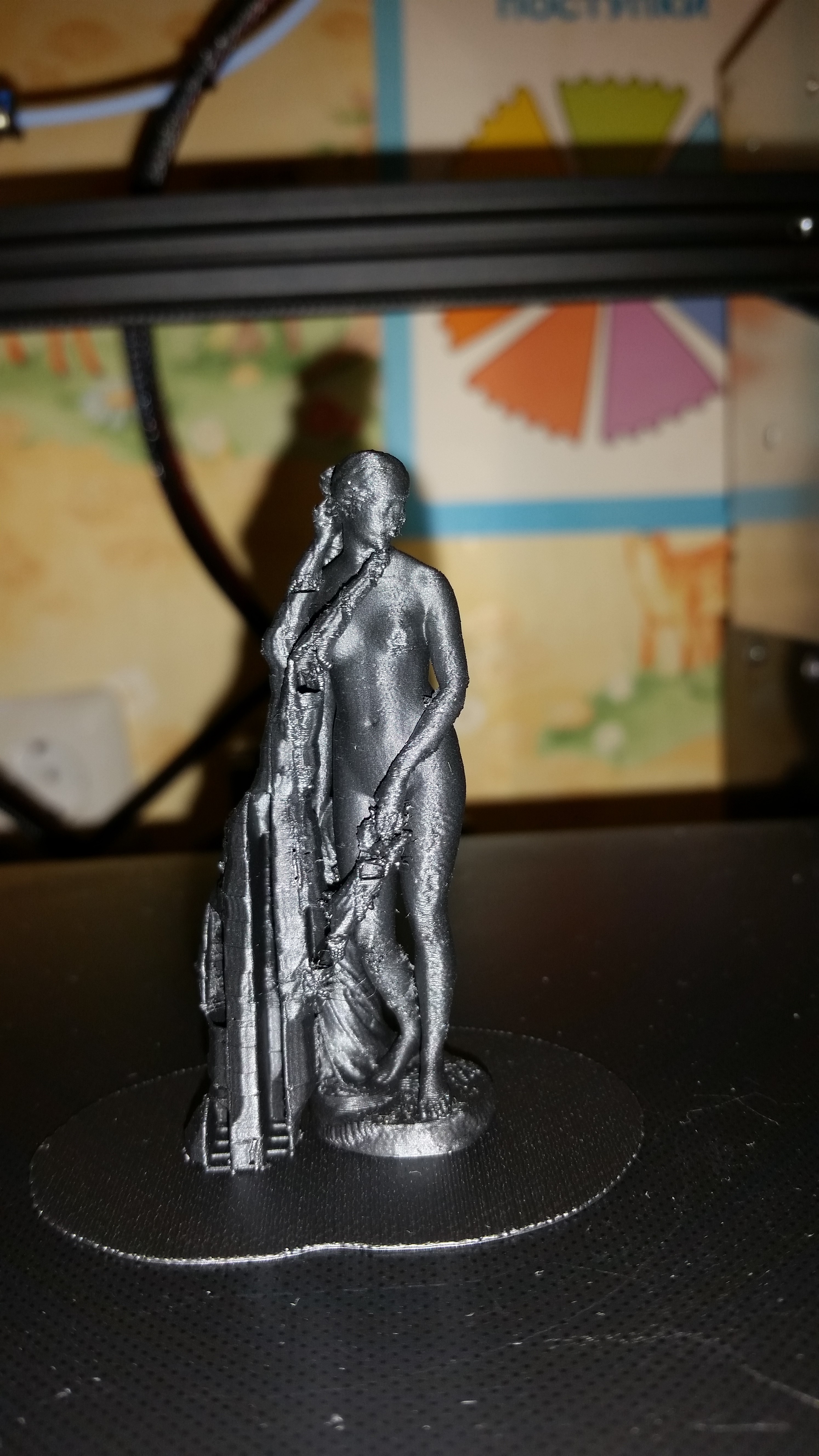 Ну и зарядил я на печать скульптуру "Греческой служанки" с параметрами 265/100, ретракт 8/30, скорость 50, обдув 0 (помня про ABS), на рафте. Фото этой распечатки не сделал, но она была "никакой", не пропечаталась пара слоев на левой ноге в районе колена, снятая распечатка практически развалилась в руках при небольшом нажатии, хотя слои вроде бы выглядели прилично. Расстроился и пошел спать.