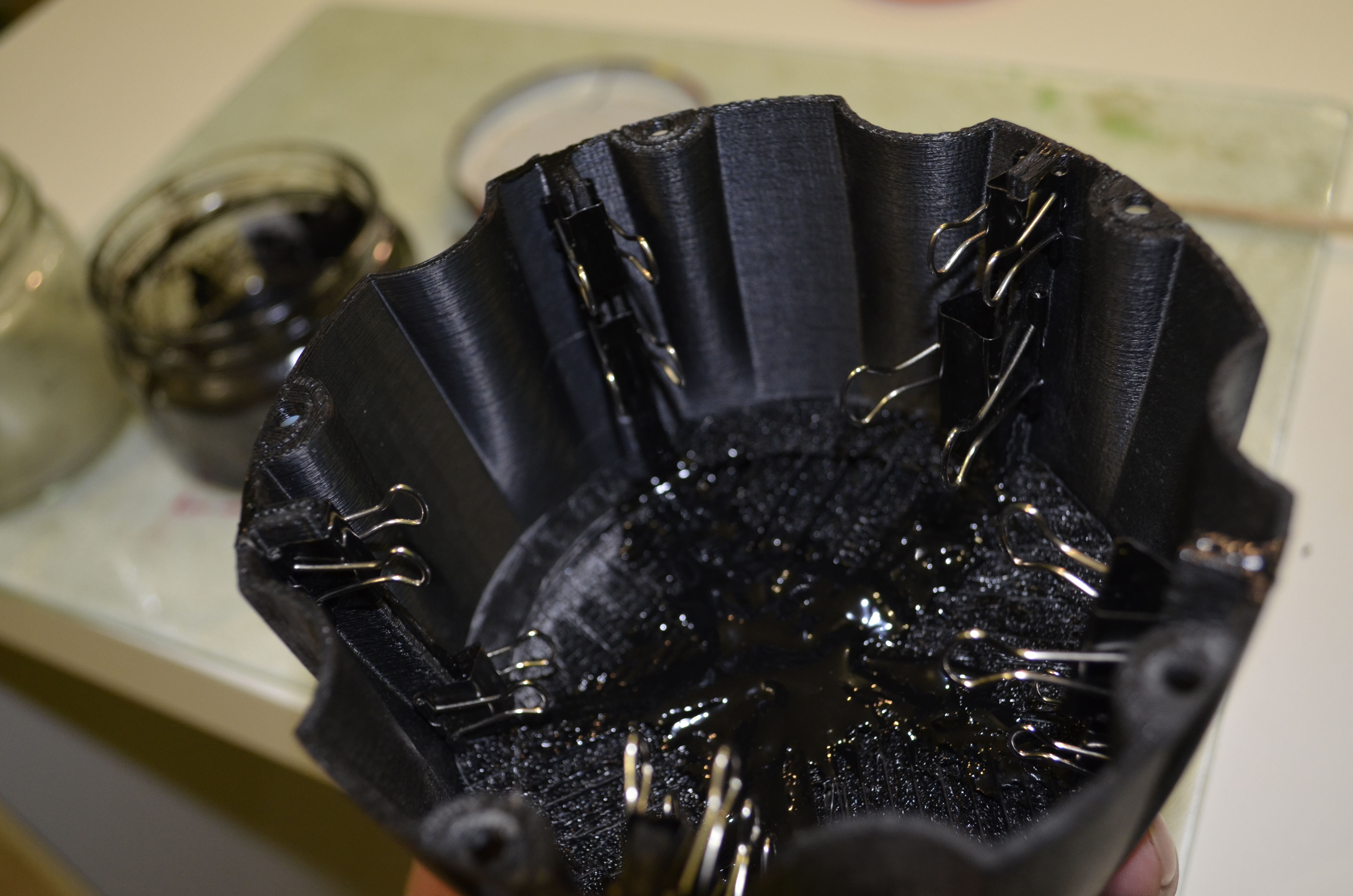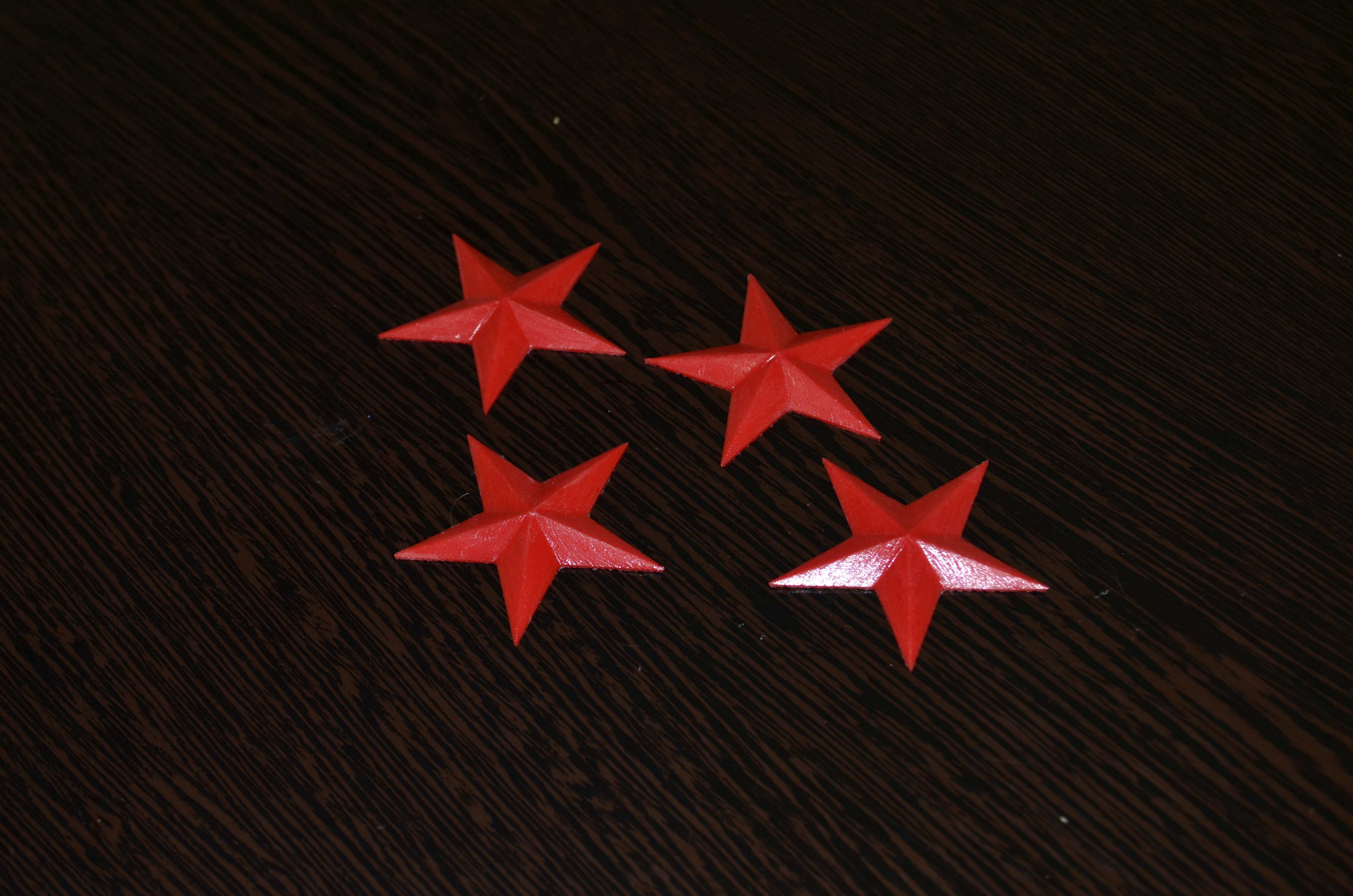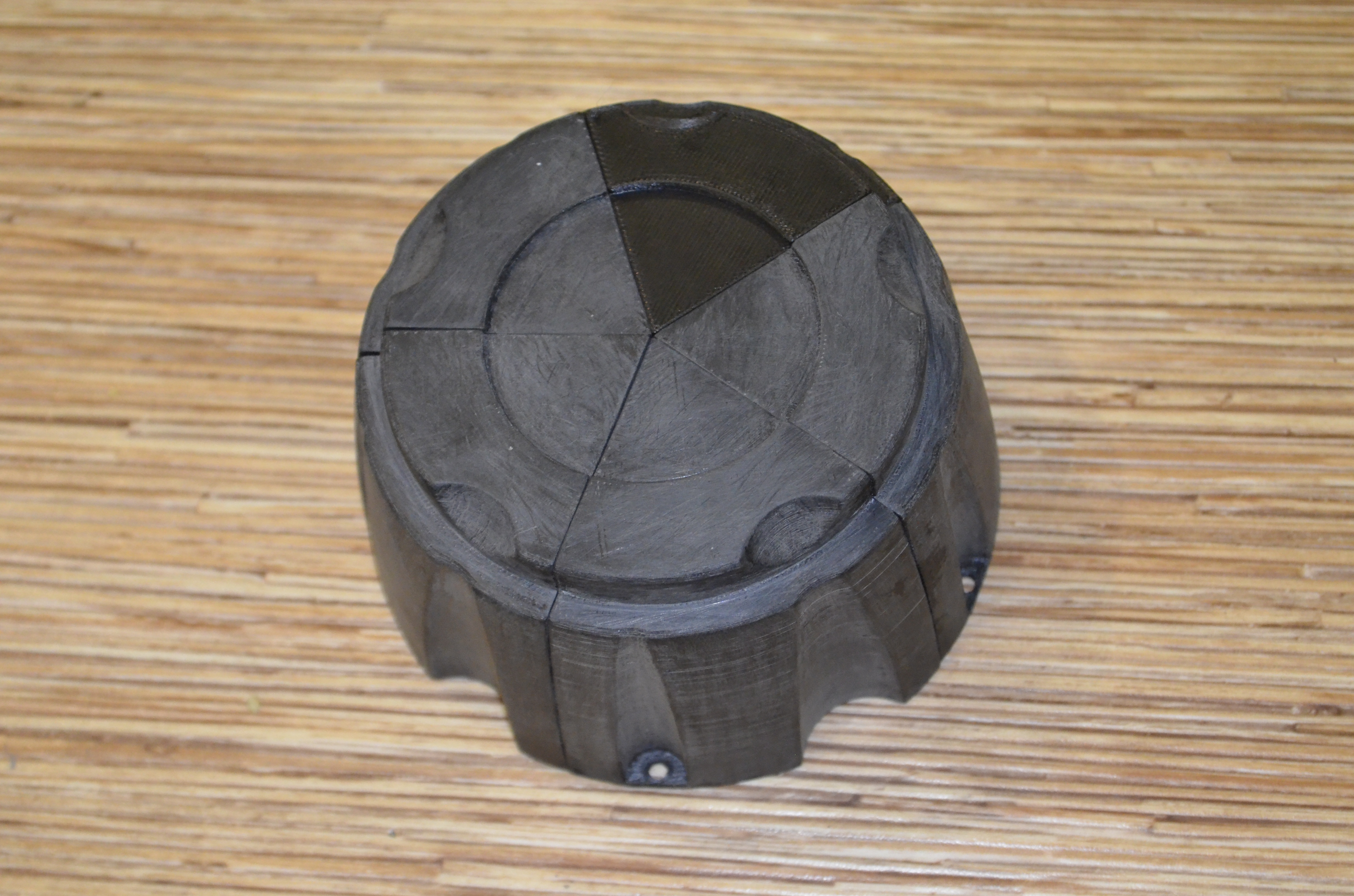 Напечатанные 4 сектора стоят облокотивший друг на друга, в это время 5-й уже в печатиА вот и пятый, только из принтера и поэтому еще без шкуринга:Затем все это добро склеивается:и на зажимы пока не высохнет (поддержки снизу убирать не стал)после сушки в течении суток аккуратно ножом убираем все лишнее:и опять шкурим (фото конечно не получилось, но другого нет):затем обработка ацетоном и вот что получаем:Так как на исходных колпаках были эмблемы в виде 'R', а на новом ее нет - было принято решение заменить их на что-то другое. Заказчик выбрал звезды:Всем спасибо за внимание!