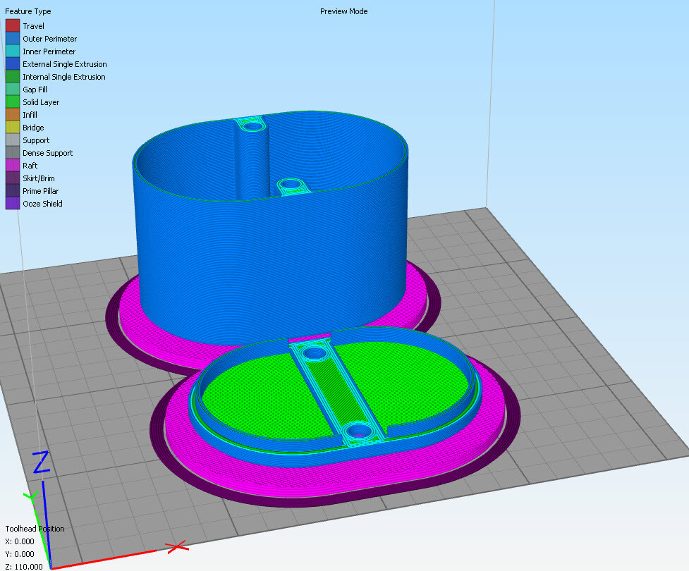 Для печати рафта использовался виртуальный экструдер слайсера с меньшими настройками ширины экструзии и потока, чем у основного – это позволило получить гладкую поверхность первого слоя детали.