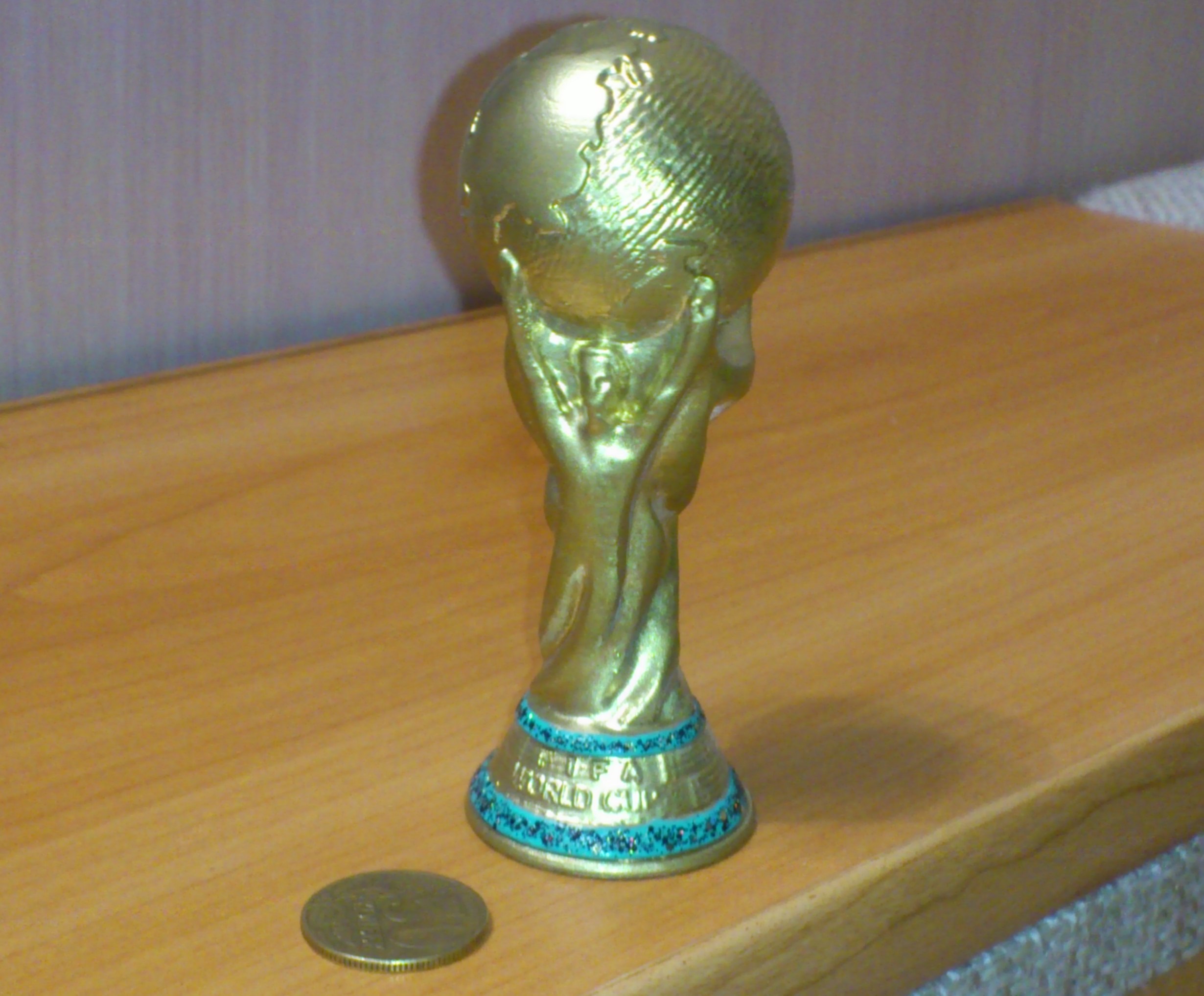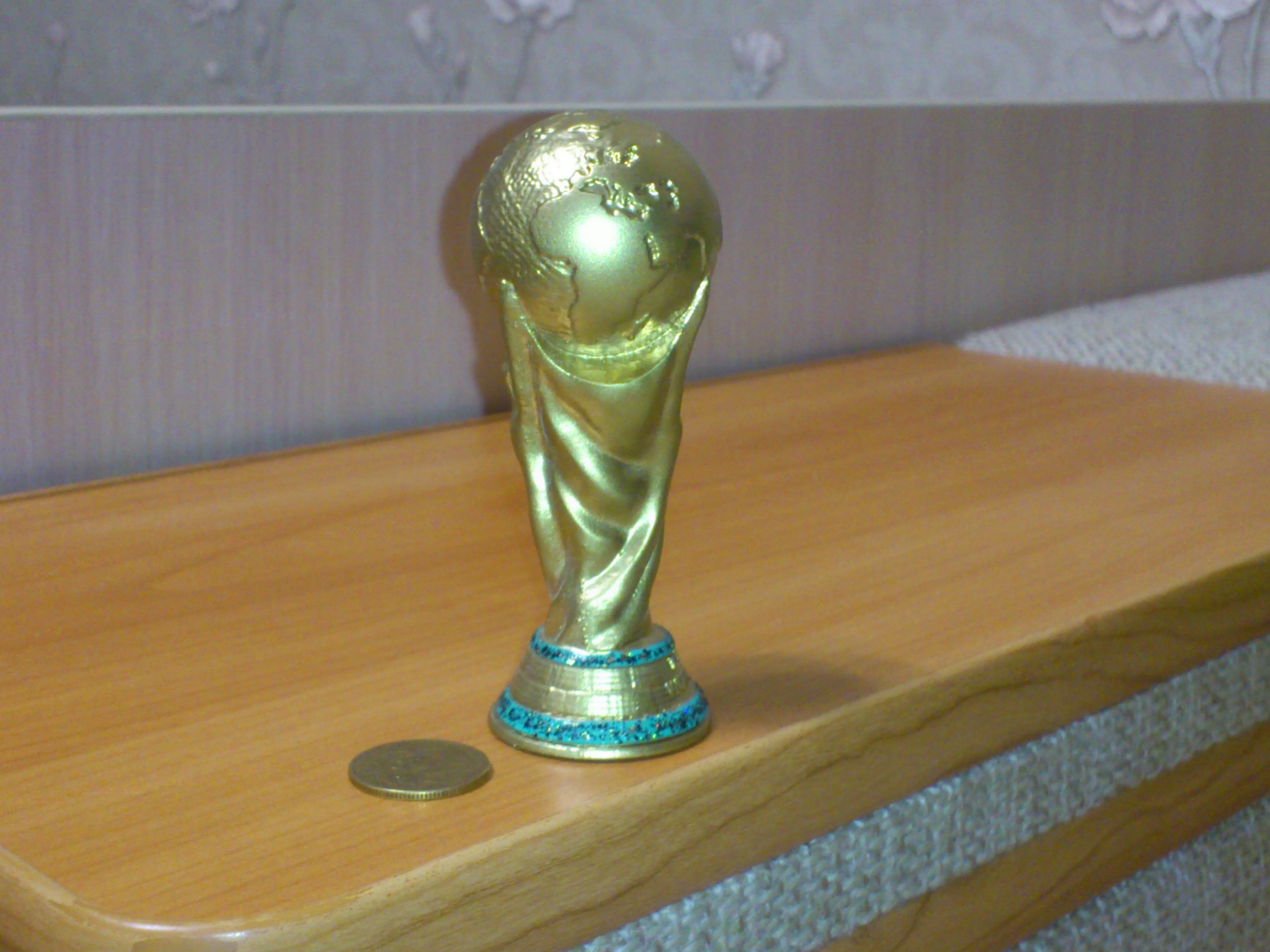 Покрыл аэрозольной краской под золото. Зелёные кольца - лак для ногтей (ближе цвет не нашел).Эту вещь, как утешение, подарю товарищу - заядлому болельщику, который не сможет попасть на игры, так как работает в органах и будет на страже порядка. А коллегам напечатаю из PLA GOLD. Время до июня ещё есть.