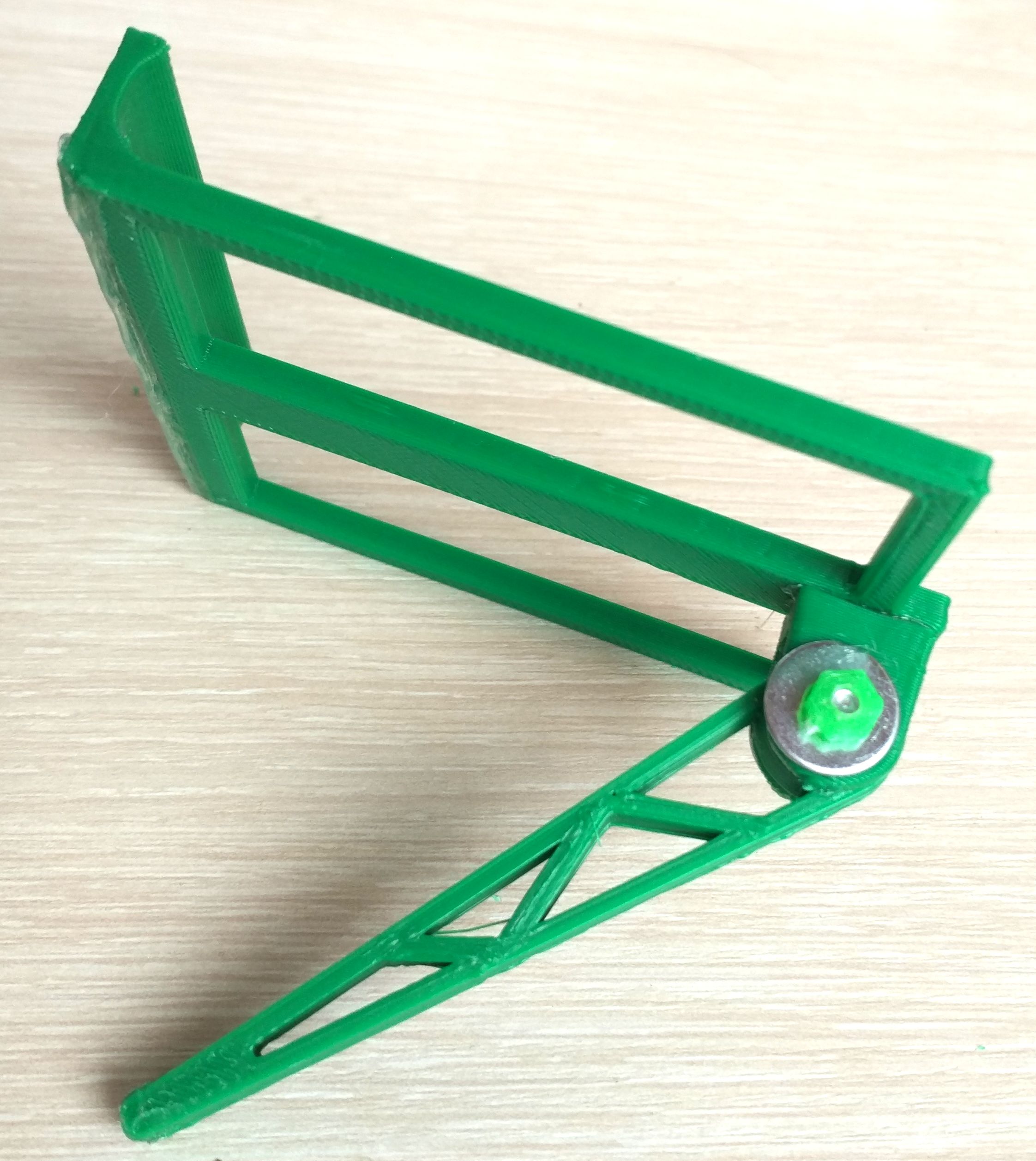 Получилось сделать легкую (10 - 15 грамм) и регулируемую усилием угол подставку. Делал для 5,2' телефона.