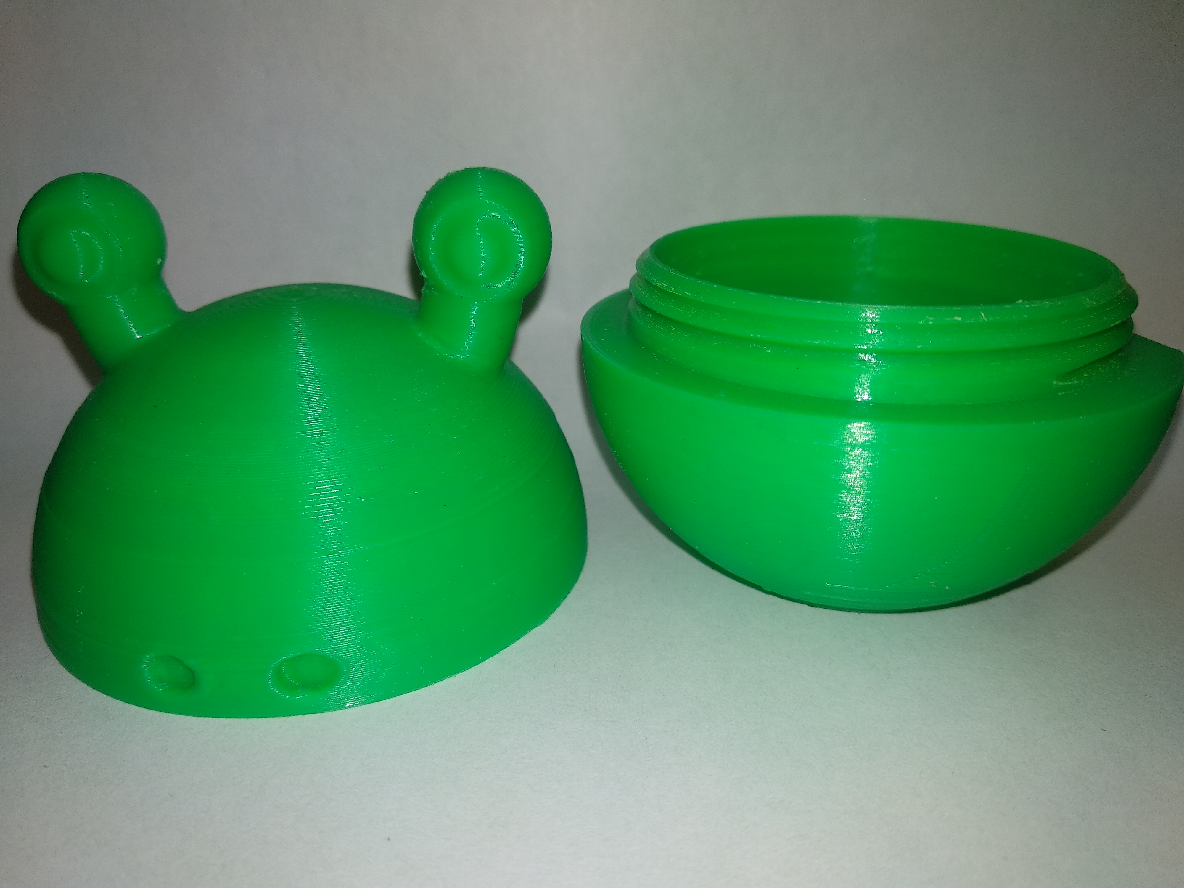 Вот для ребенка в Компасе начертил лягушку. Очень о любит лягушек и еще котят. Ну и тренироваться может раскручивать и скручивать игрушку. После печати надо немного разработать резьбу и тогда легко ходят половинки друг в друге.