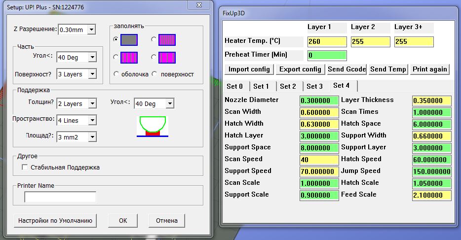 Рядом стоит отремонтированный UP! plus (1st gen), который нужно оттестировать и отправить. Загружаем в слайсер модели, крутим и размещаем. Пластик в АП заправлен тоже тестовый - ABS с температурой экструзии 250-255 градусов.Настройки:И печатаем 40 минут.Теперь это его любимый инструмент.