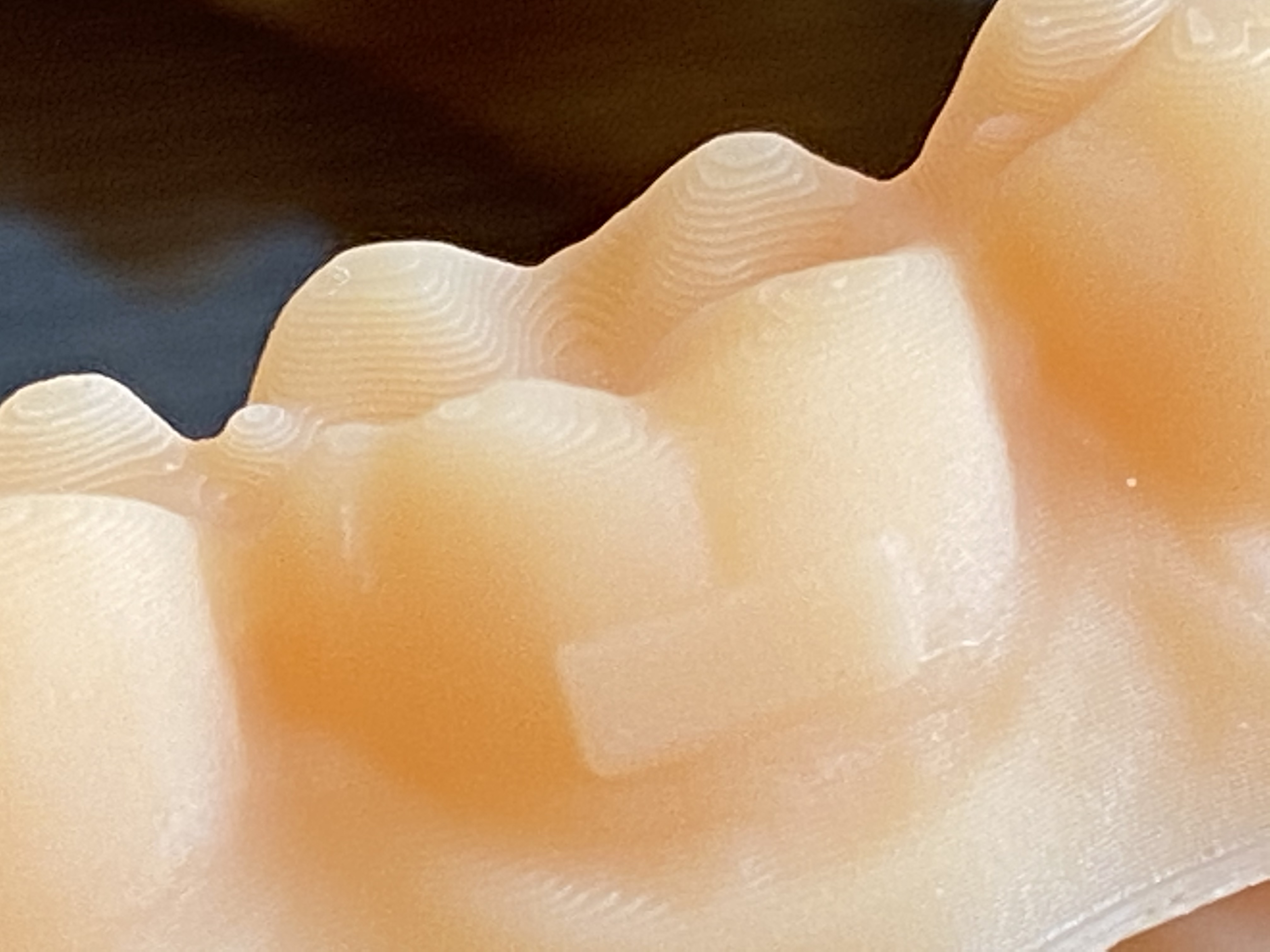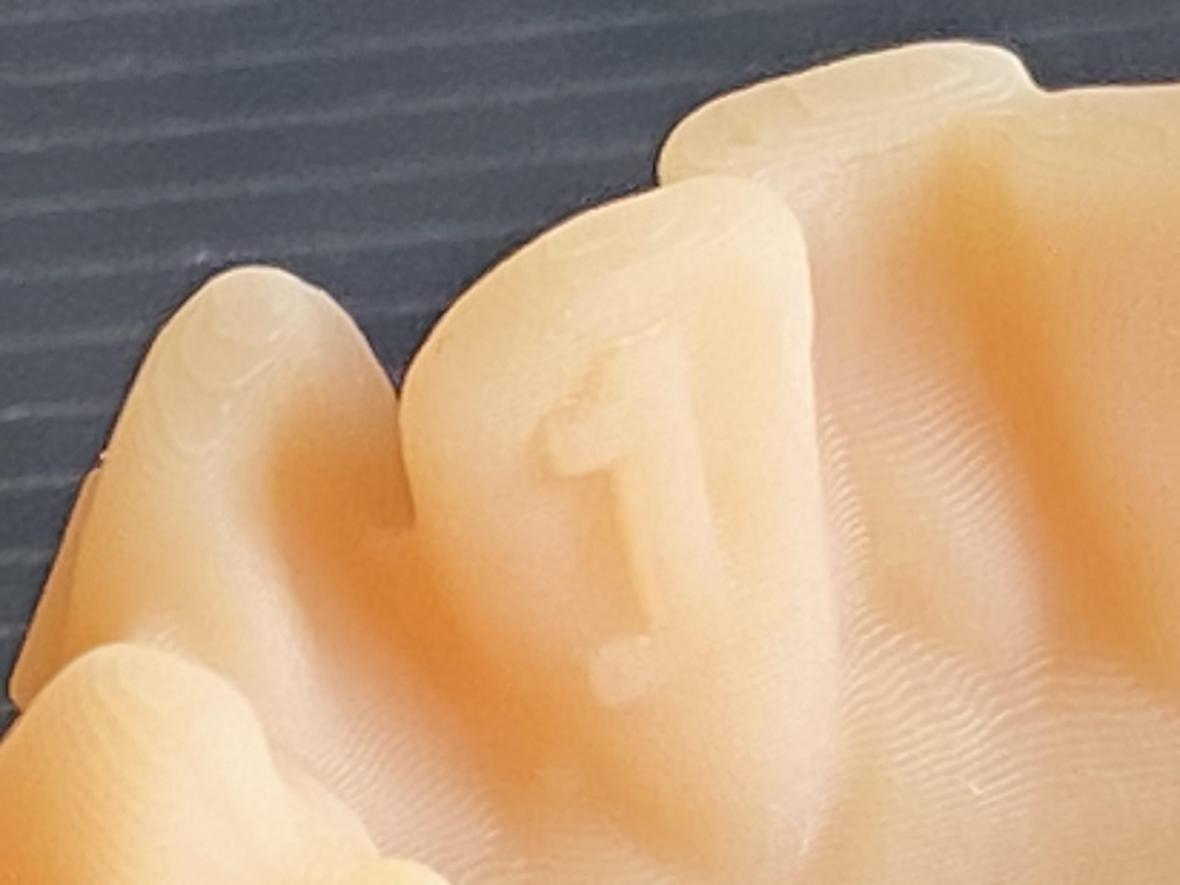 Полимер достаточно быстрый для получения такой детализации, прочный, не трещит при снятии со стола даже тонких полых моделей. При термоформовке не оставляет сколов внутри элайнеров. Обладает высокой стабильностью печати, достаточно один раз подобрать режимы, и можно больше не подгонять, от бутылки к бутылке идёт стабильная печать.