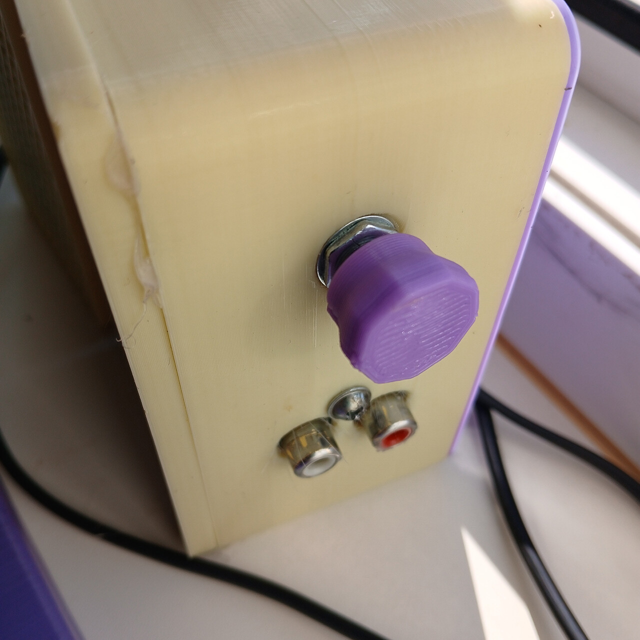 Декоративные накладки просто приклеены термо-клеем из пистолета. Задняя крышка вставляется внутрь и вполне себе держится послойным зацеплением. Вертикальная стенка, корпуса динамика, дуго-образная.