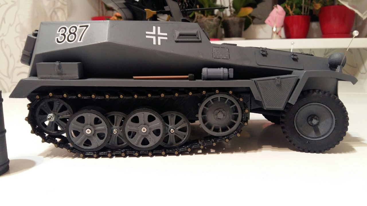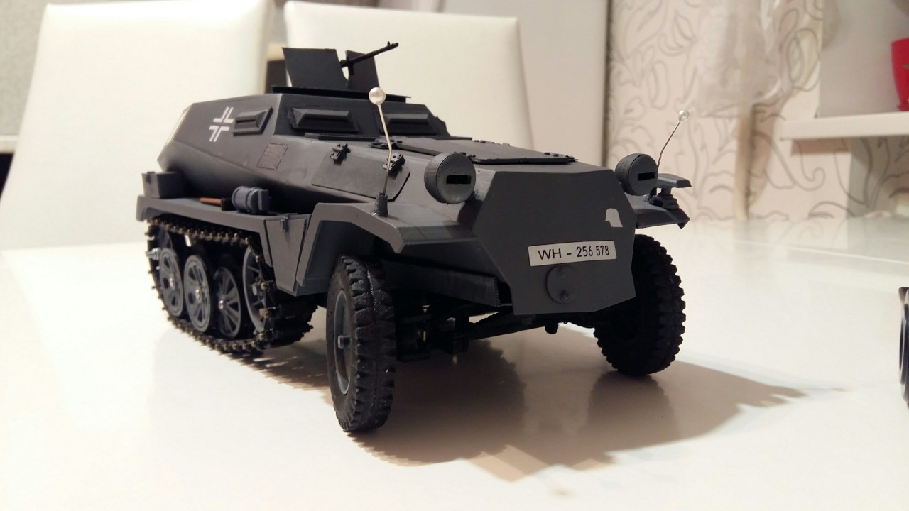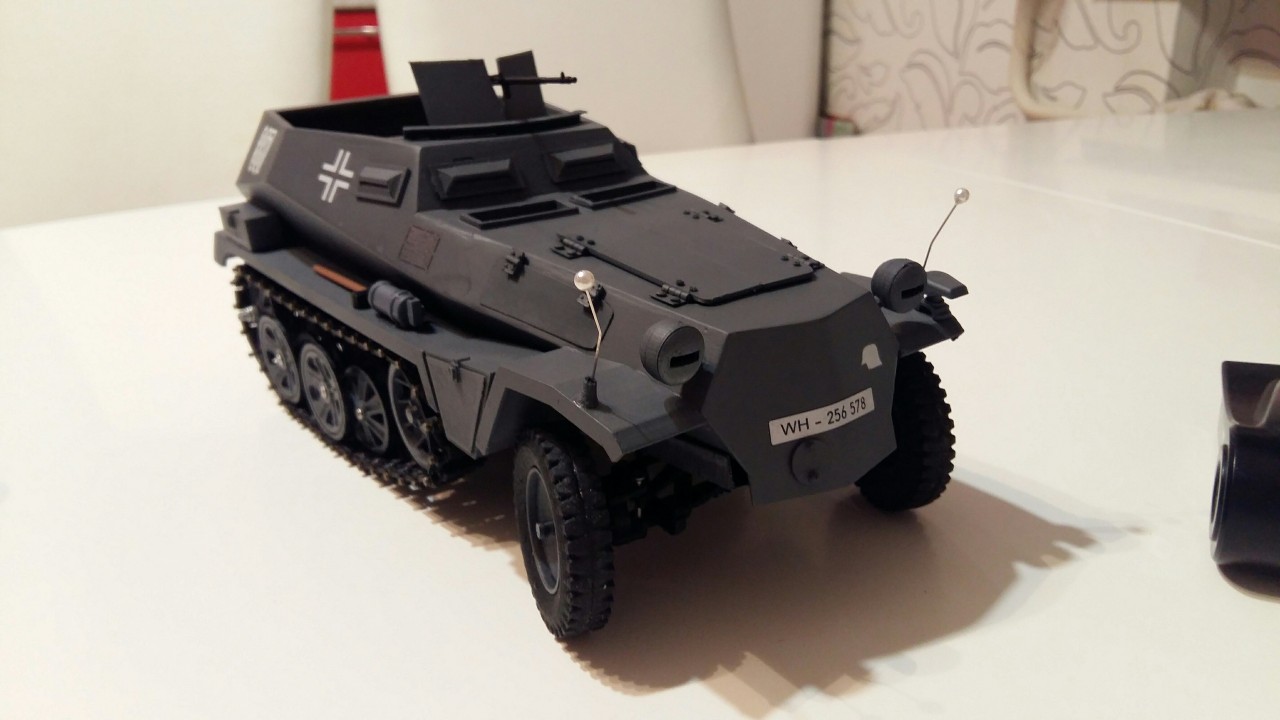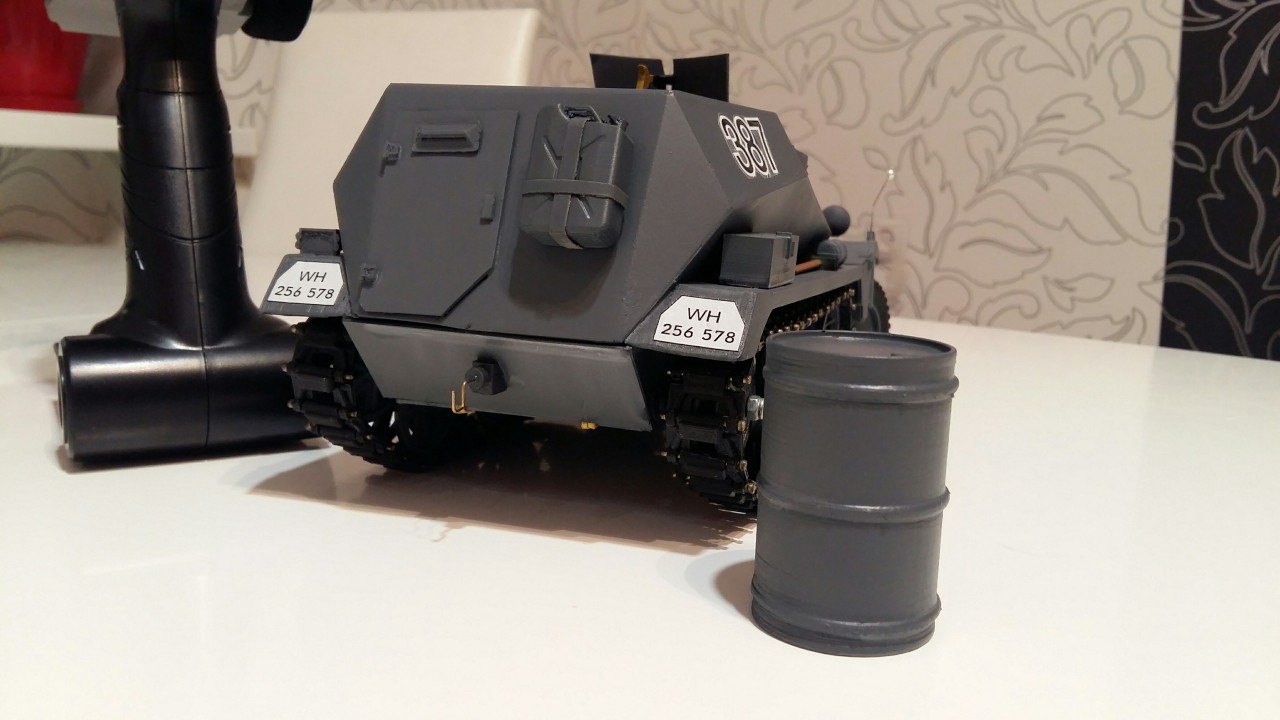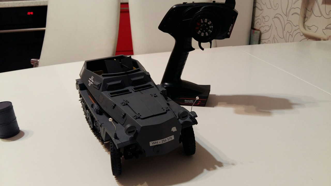 окраска - баллончики Tamiya, декали сделаны на заказ, частично использованы от танков Heng Long. Модель двигается, имеет звук двигателя, озвучку пулеметов.