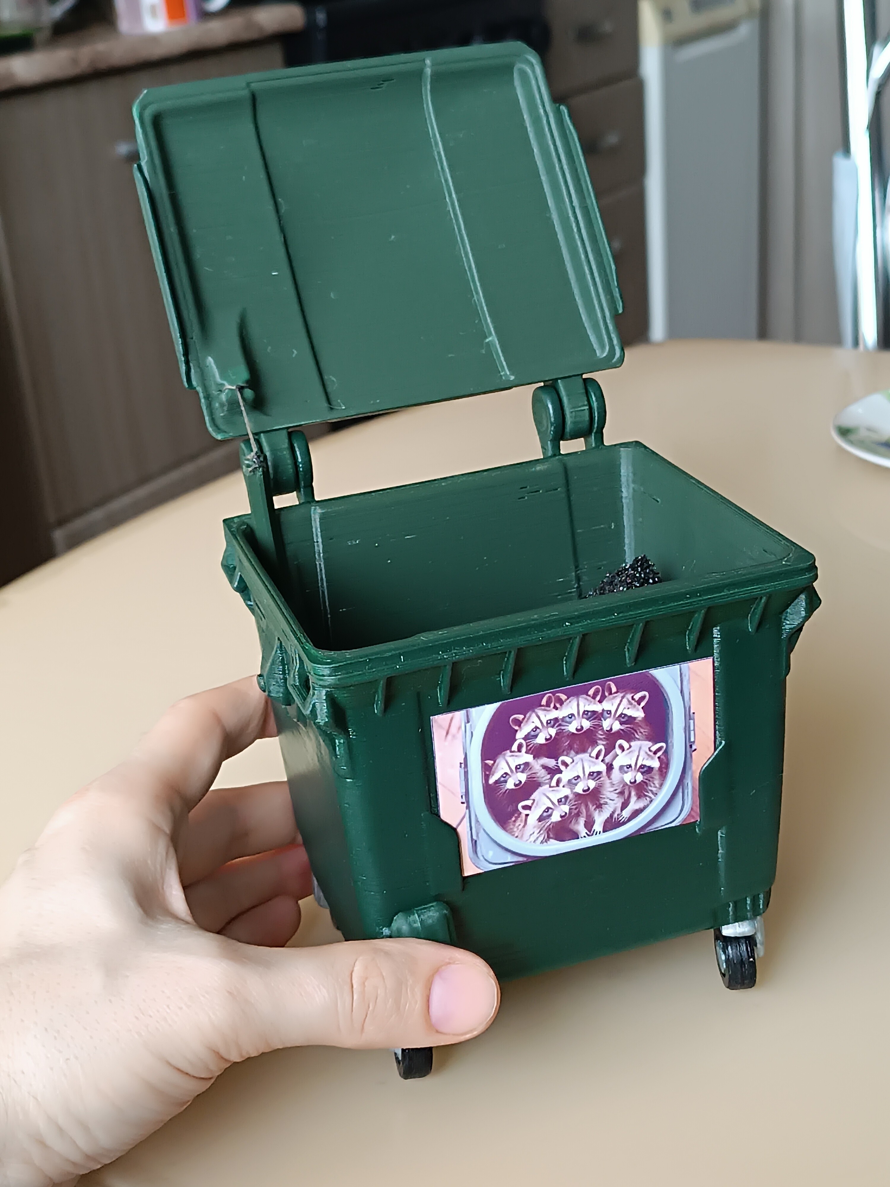 Потом распечатал размер побольше для складывания отходов печати (175% от изначального масштаба) из старинного ПЛА пластика от REC. Крышка уже захлопывается с солидным таким лязгом. Пока не придумал как смягчить звук.