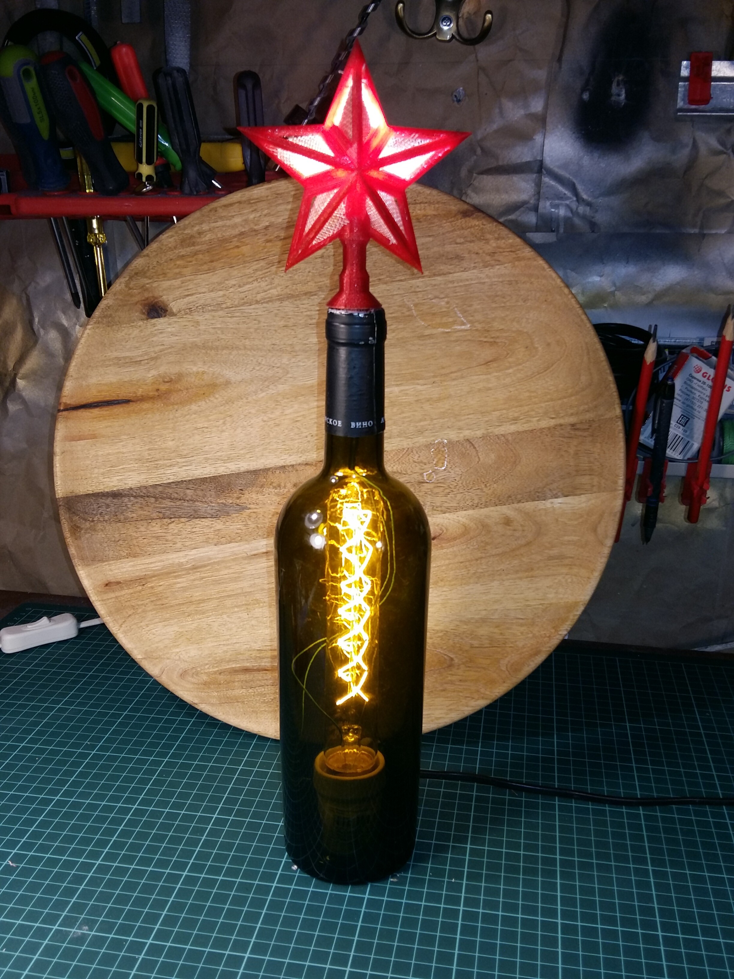 Высверлил алмазной коронкой дно у бутылки вставил в неё лампочку Эдиссона. Здесь: распечатал собрал навершие- звезду. получилось вот так.