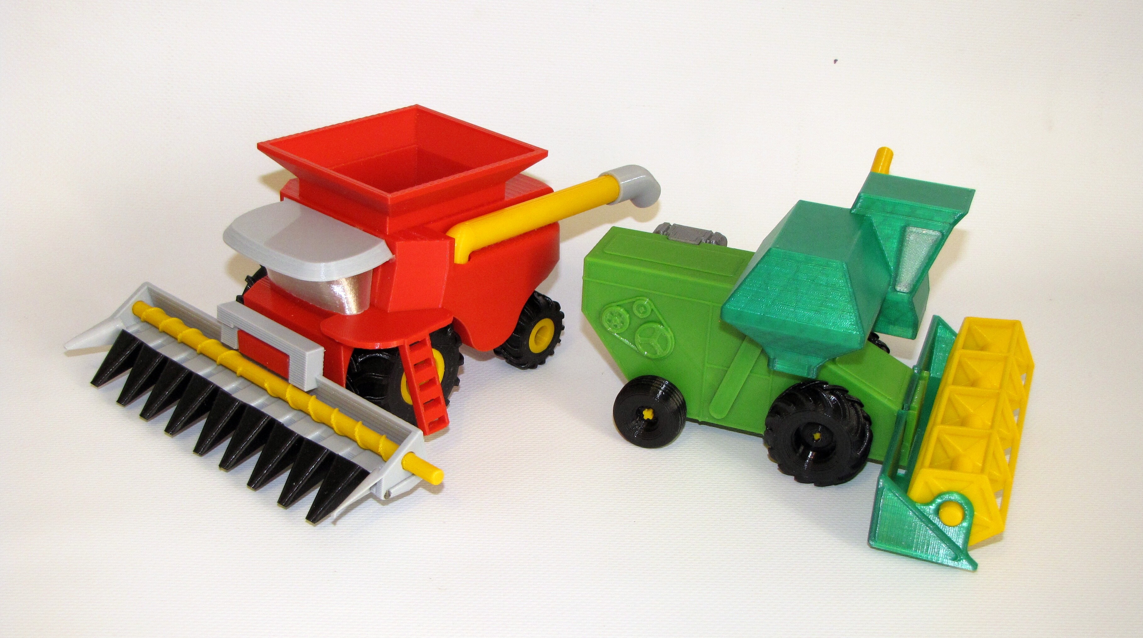 Модели не очень большие, тракторы в длинну примерно 10-11 см, прицеп так же 11-12см, комбайны немного побольше, в пределах 15-17см.