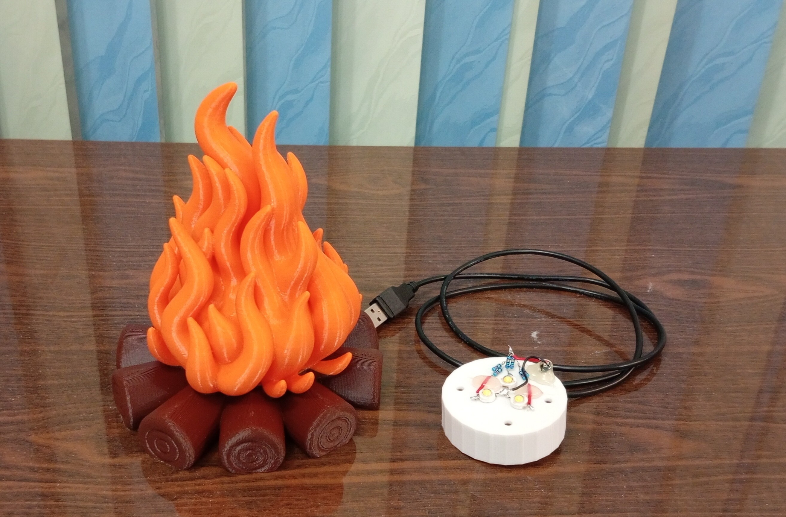 В большой костер поставил простые диоды, он не мигает. Заморачиваться с ардуинками было лень... Диоды поставил одноваттные 3шт, но запитал через сопротивление, снизив ток, яркость упала не сильно, при этом нагрев свёл к минимуму. Сопротивление ставил 40омм (2*80омм) для каждого. Питание от 5 вольт, любой источник.