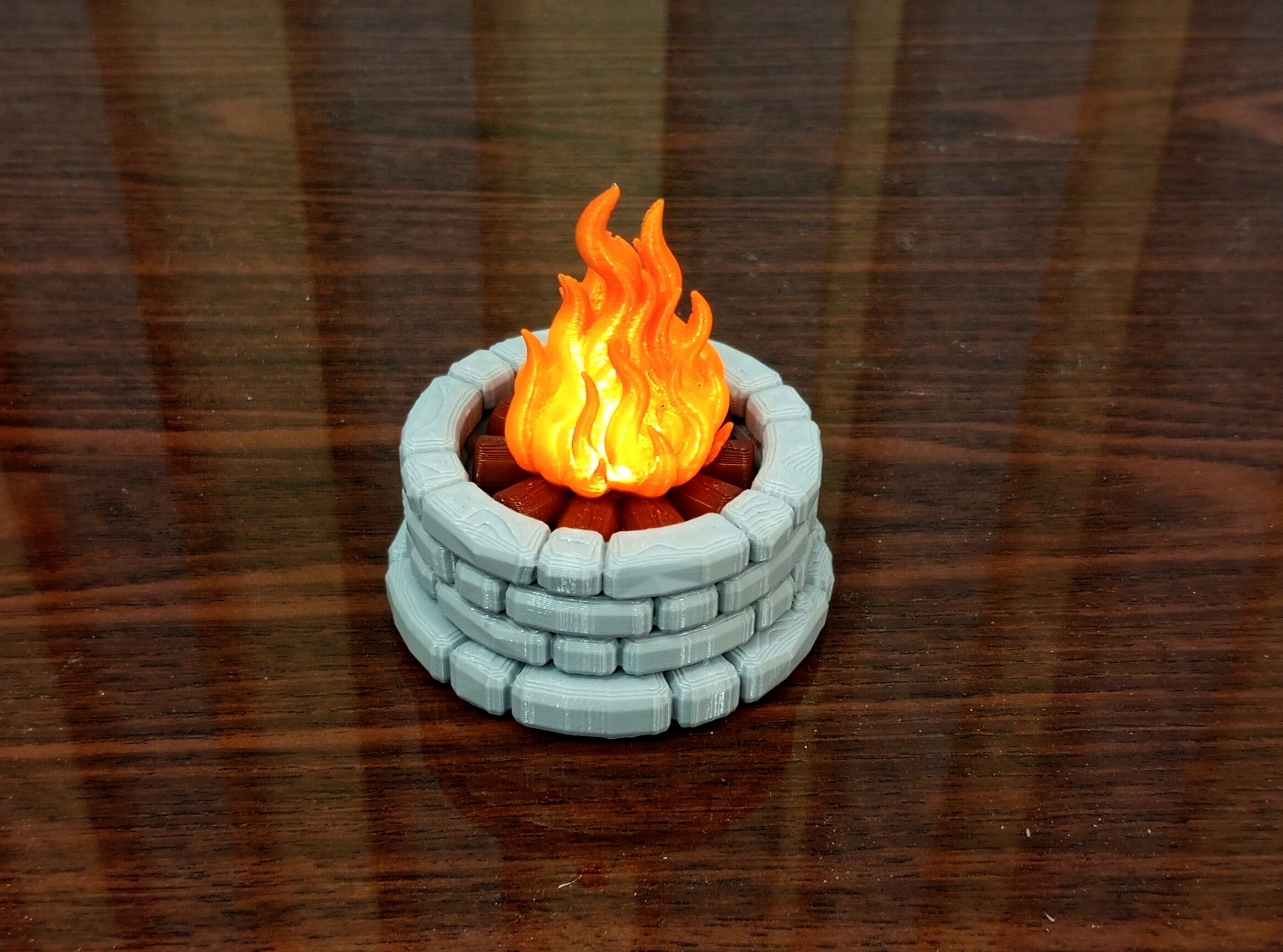 Для мини варианта, чтоб можно было всунуть подсветку напечатал "каменную" подставку. В качестве подсветки, использовал обычную светодиодную свечку. Там диодик ещё и подмигивает, таким образом создается полная иллюзия что костер живой...