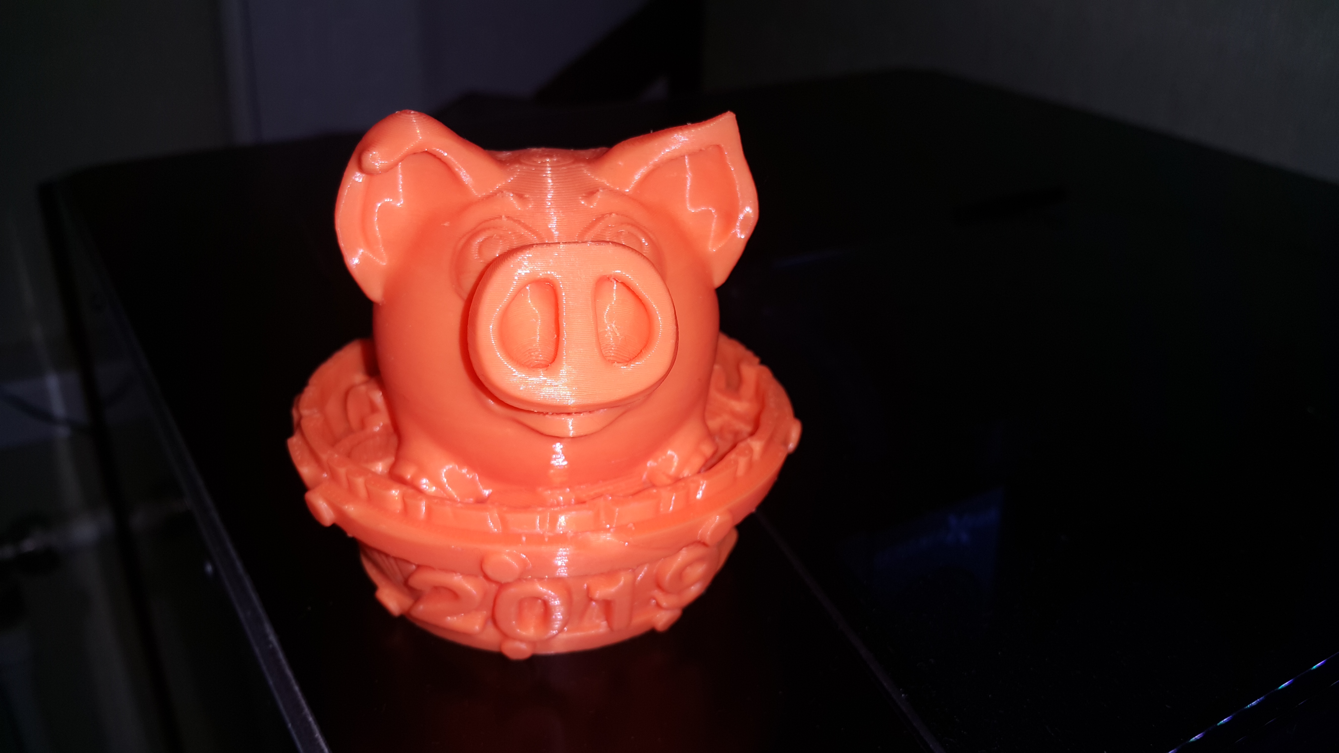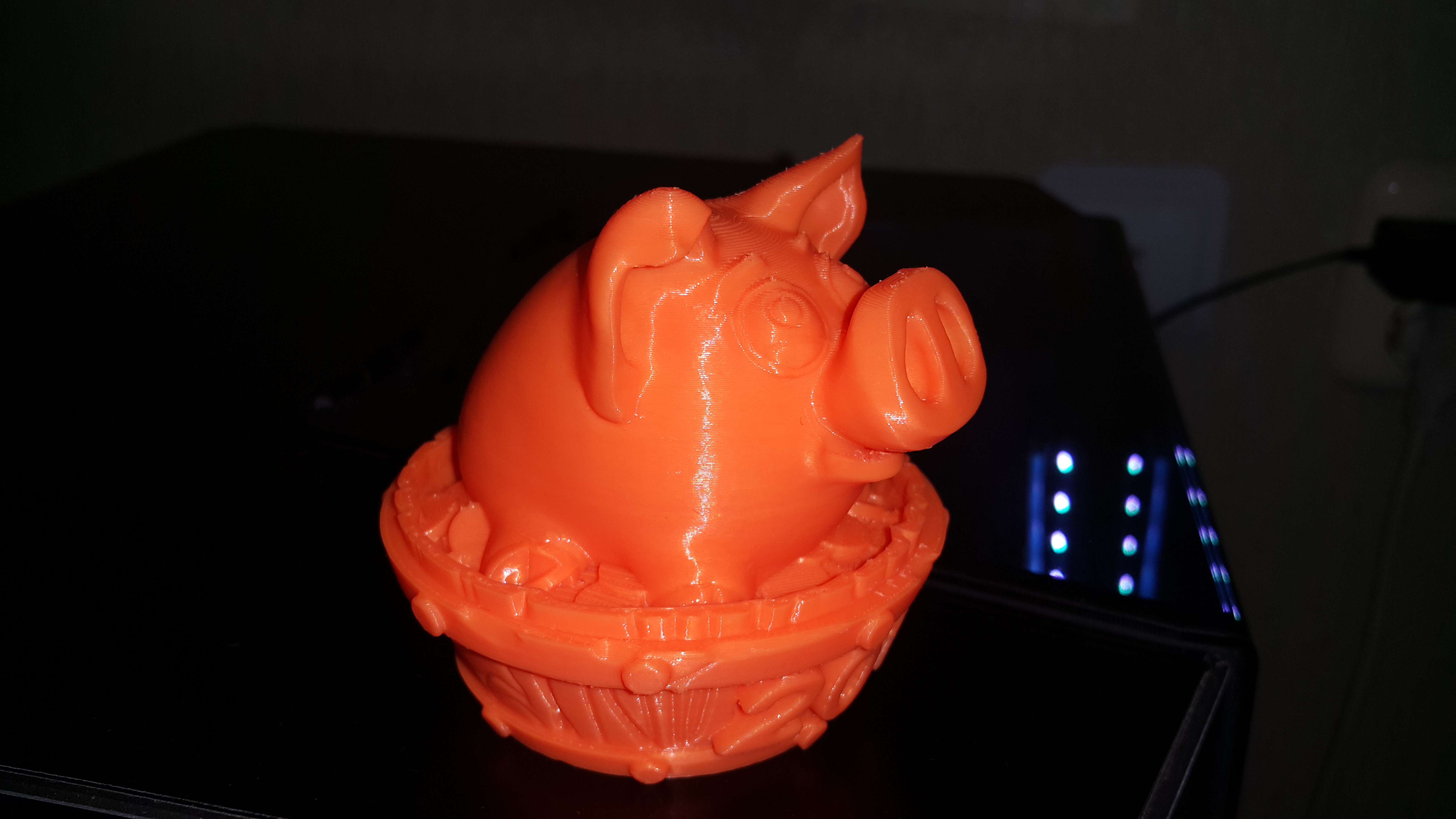 Решил печатать полнотельную, т. к. если печатать по частям и склеивать, то на то и выйдет по времени.Потом на этом сайте нашел свинку в моделях. Печатал PLA от Rec, слой 0.20мм, поддержки из него же. Теперь ёлочки не хватает. Захотелось из Filamentarno, но у меня только лайм прозрачный, зеленого нет. До нового года времени много, может еще закажу да распечатаю.))