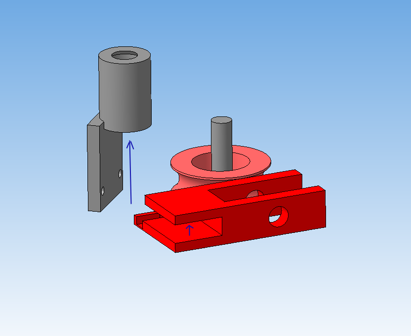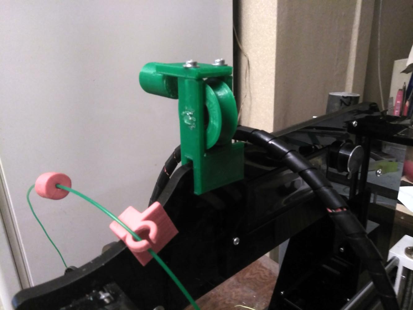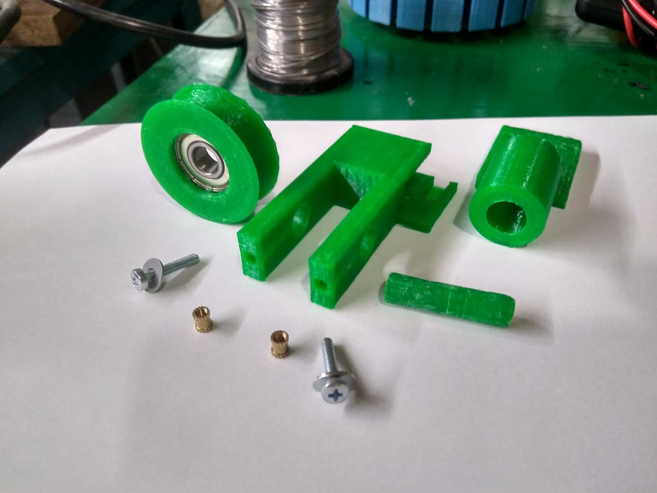 Решил сделать держатель на подшипнике, чтобы нить не тёрлась о пластик. Prusa i3, надо сказать, имеет неудобный корпус для крепления чего-либо (без сверления и т.д., а этого делать не хочется). Для того, чтобы держатель зафиксировать, был сделал паз (на 1 фото у центральной детали справа), в который с натягом заходит головка винта на корпусе принтера, и за счет этого осуществляется фиксация.