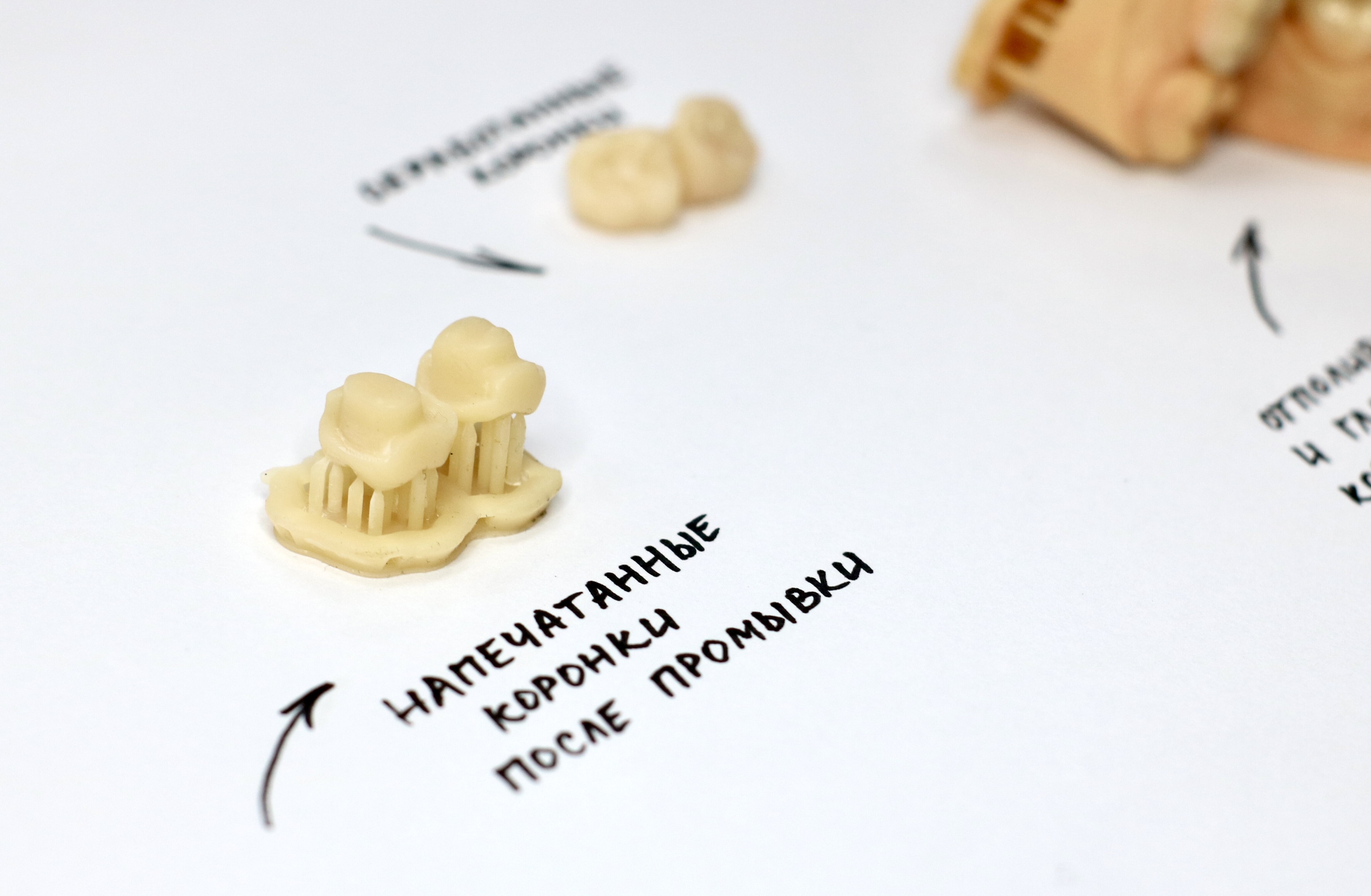 Вот так выглядят реставрации, созданные на 3D-принтере Form 3B, и прошедшие пост-обработку в устройстве для автоматической промывки - Form Wash, благодаря которому материал принимает именно те характеристики, о которых заявляет производитель.