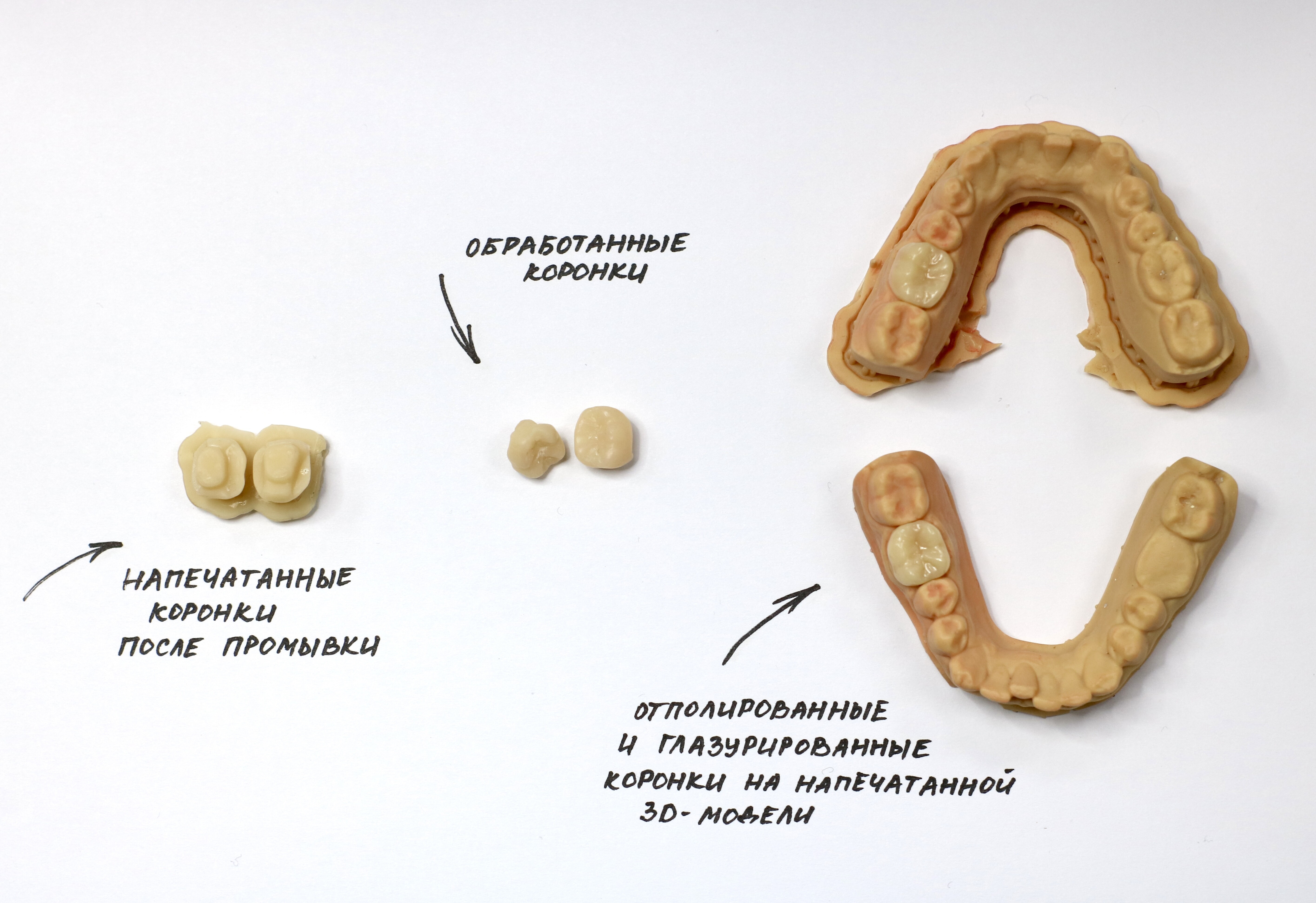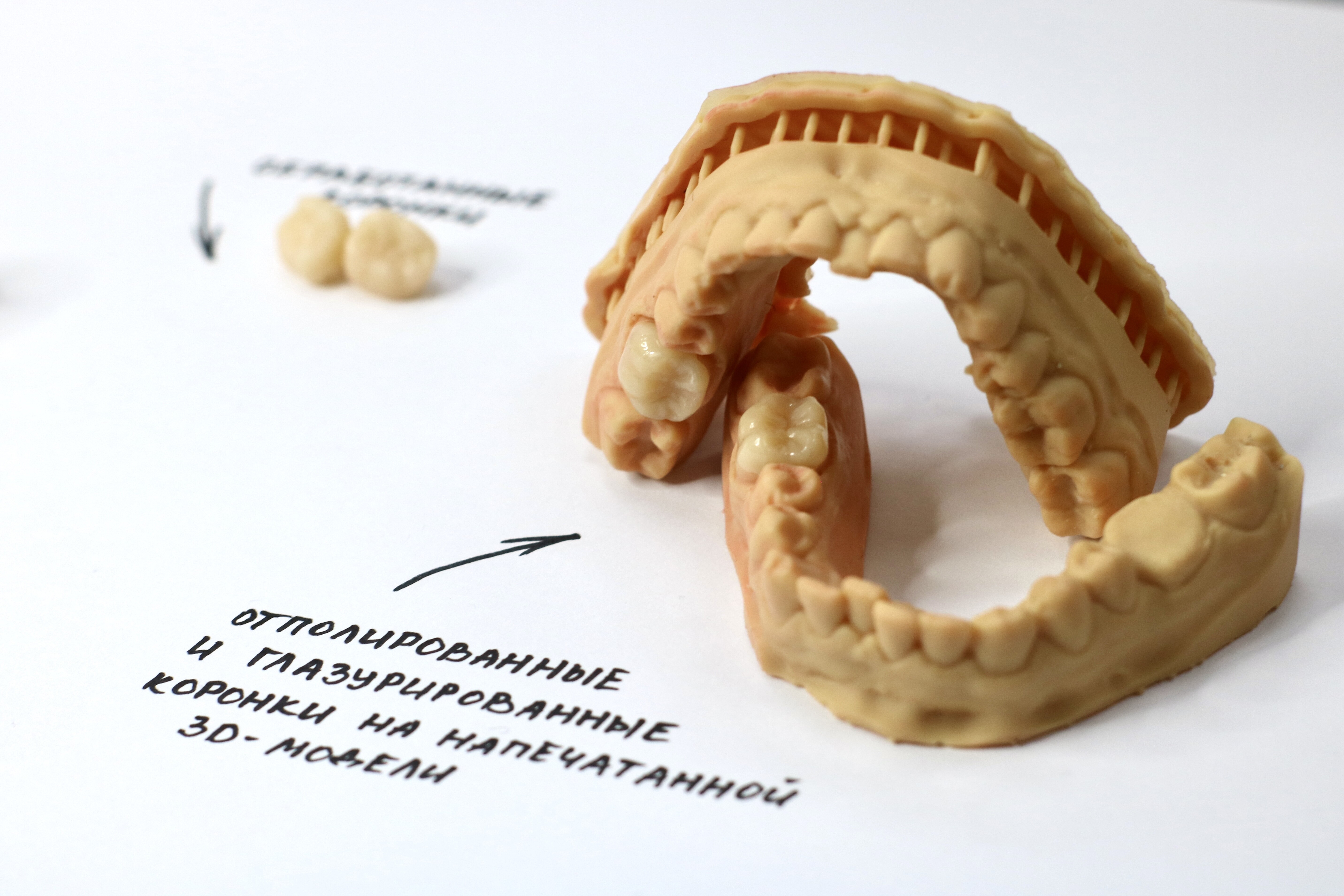 Уже готовые, отполированные и глазурированные коронки, установленные в напечатанную 3D-модель.