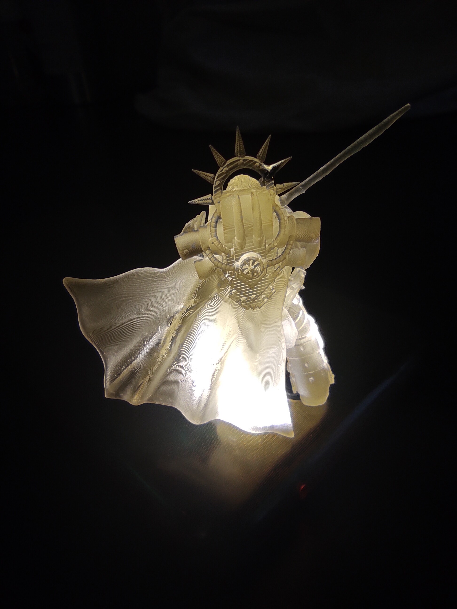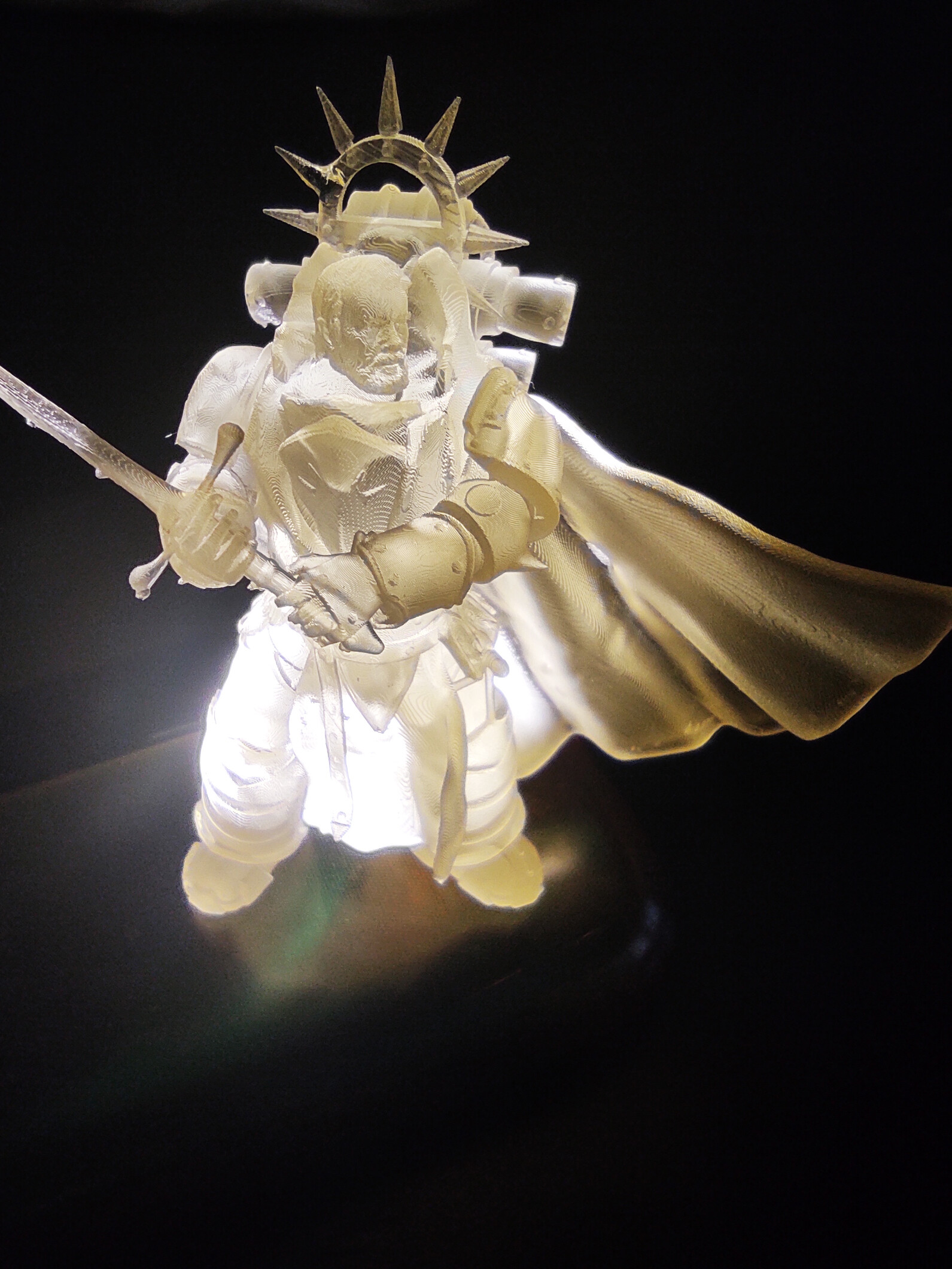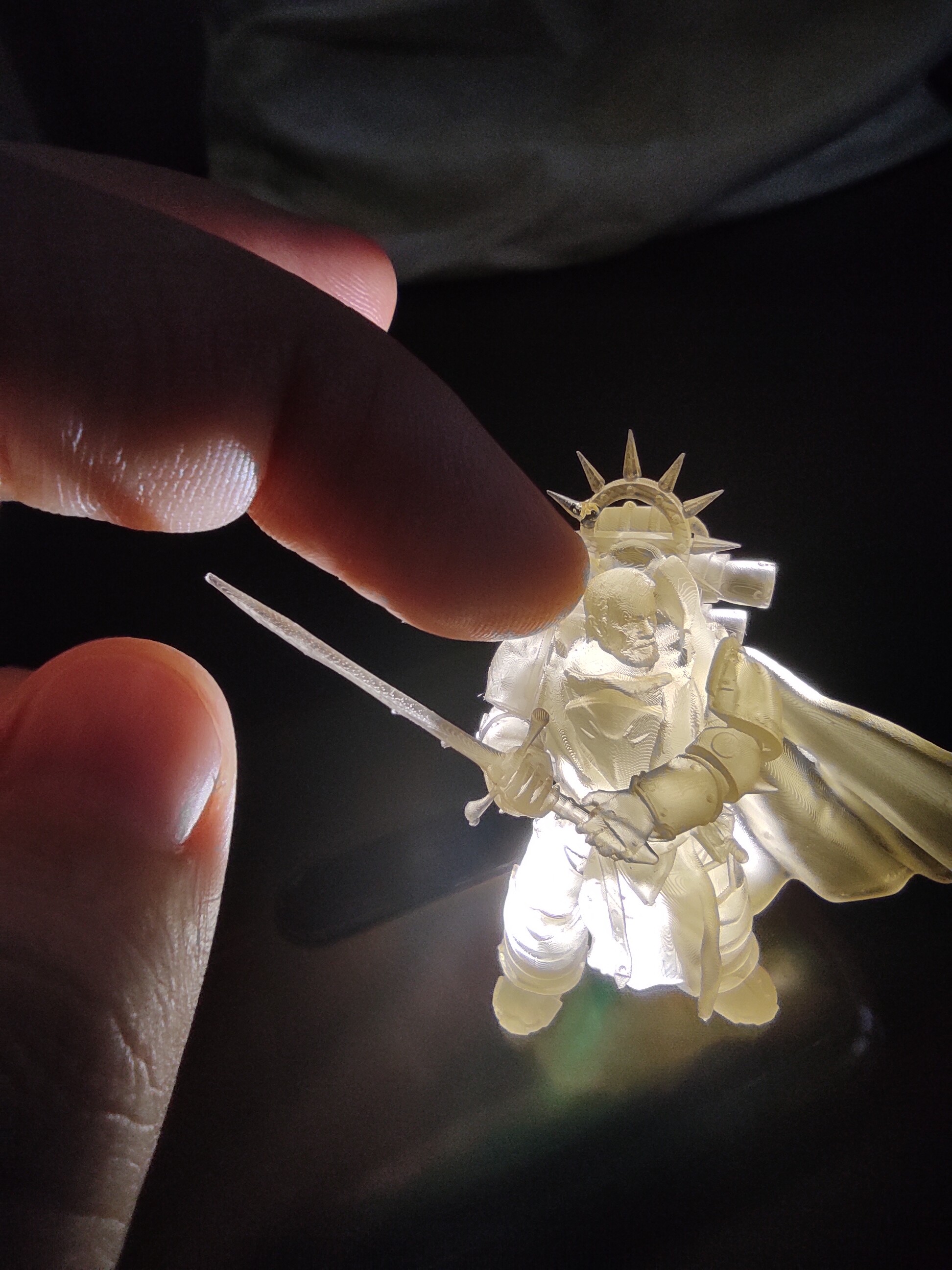 Смола KREMEN прозрачная без красителей (которые так неудачно кончились совершенно везде к началу моей фотополимерной карьеры), первый слой 50 сек, 2 сек на слой, высота слоя 50 микрон. Без пост обработки, кое-где остались шапки поддержек, но чтобы их снять точно нужен микроскоп. =) А еще я случайно сломала один из шипов нимба и пришлось сделать быстрый ремонт с помощью капельки смолы и уф-фонарика.