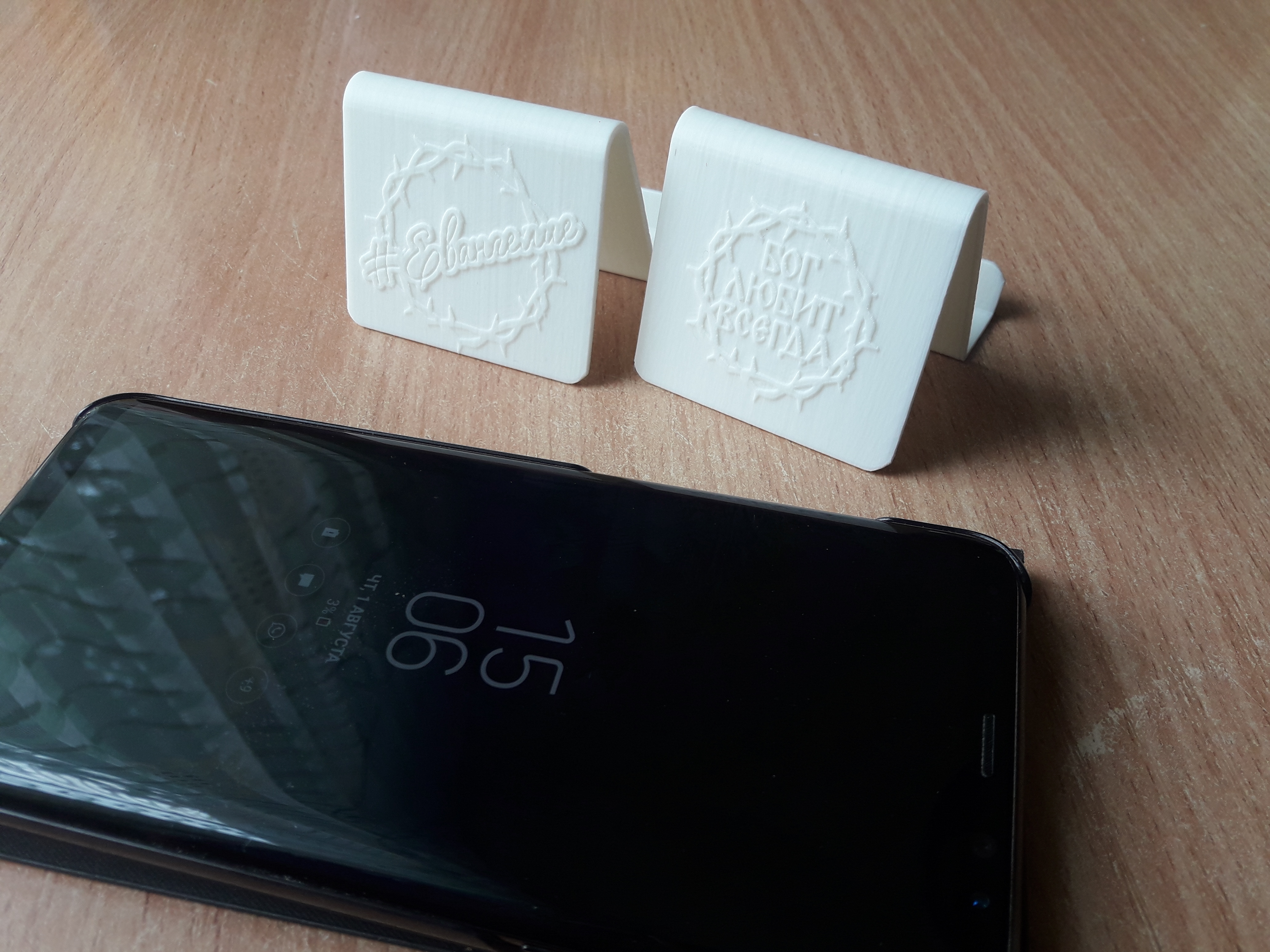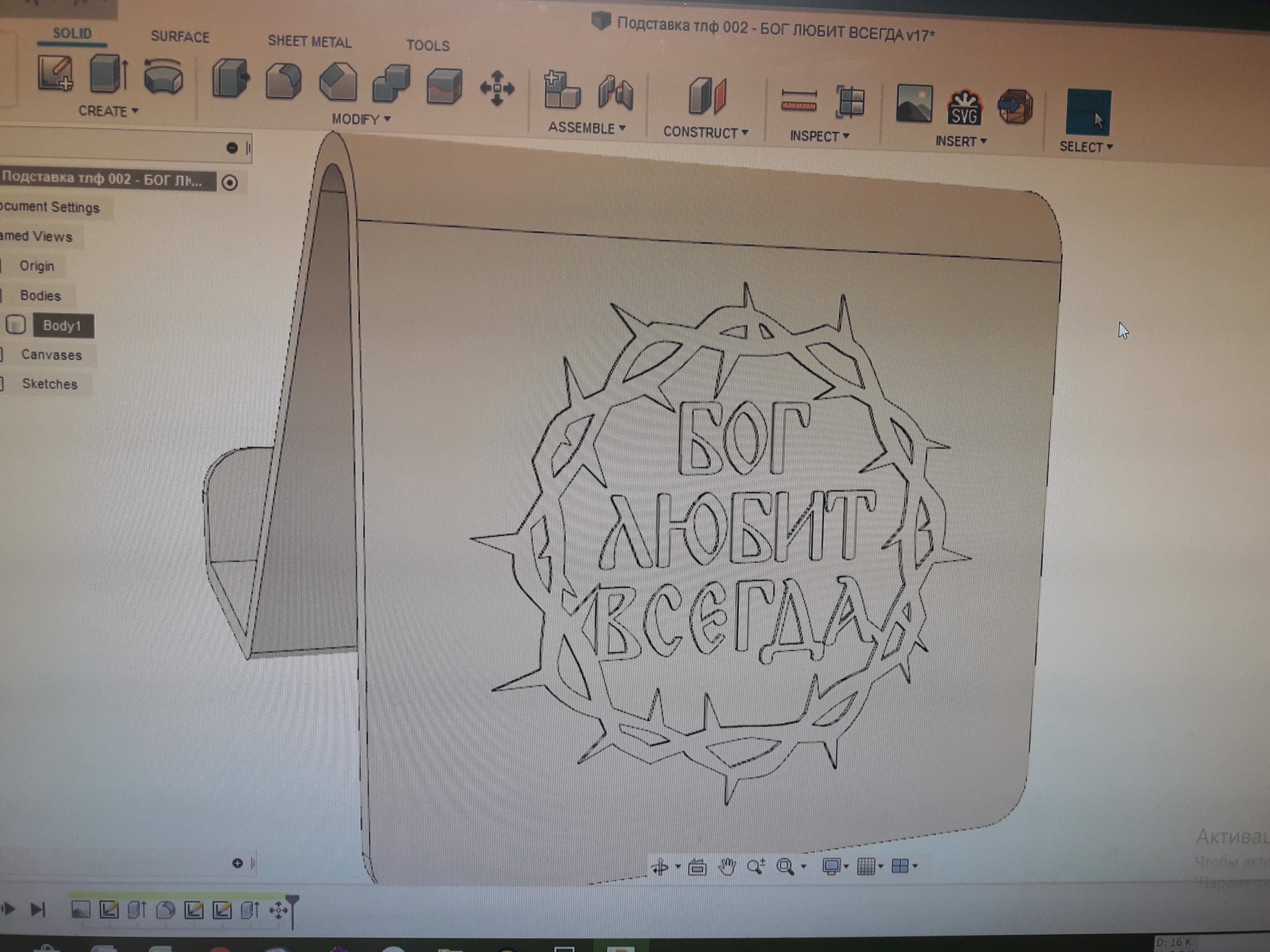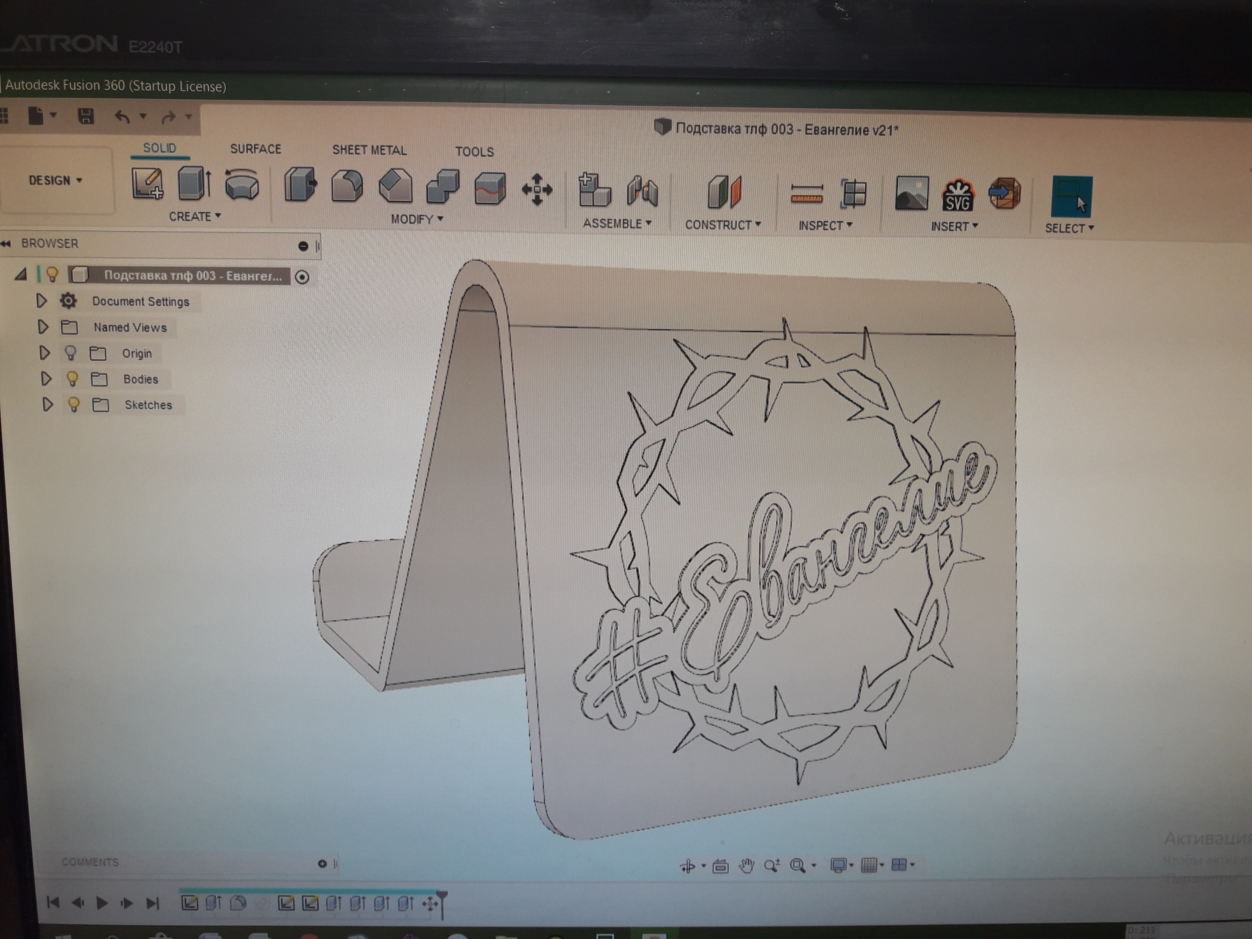Вот кадр с подготовки:И очень уж мне понравилось оформление кафедры. Она так до сих пор и осталась - надпись #Евангелие на фоне стилизованного тернового венца. Первым делом сделал себе фото на экран смартфона:Ну и естественно появилась мысль о подставках для телефона, которых ни у кого нет!)))Контуры надписей обвёл в бесплатной программе Inkscape (там очень удобно работать со сплайнами), затем кинул в Fusion360.