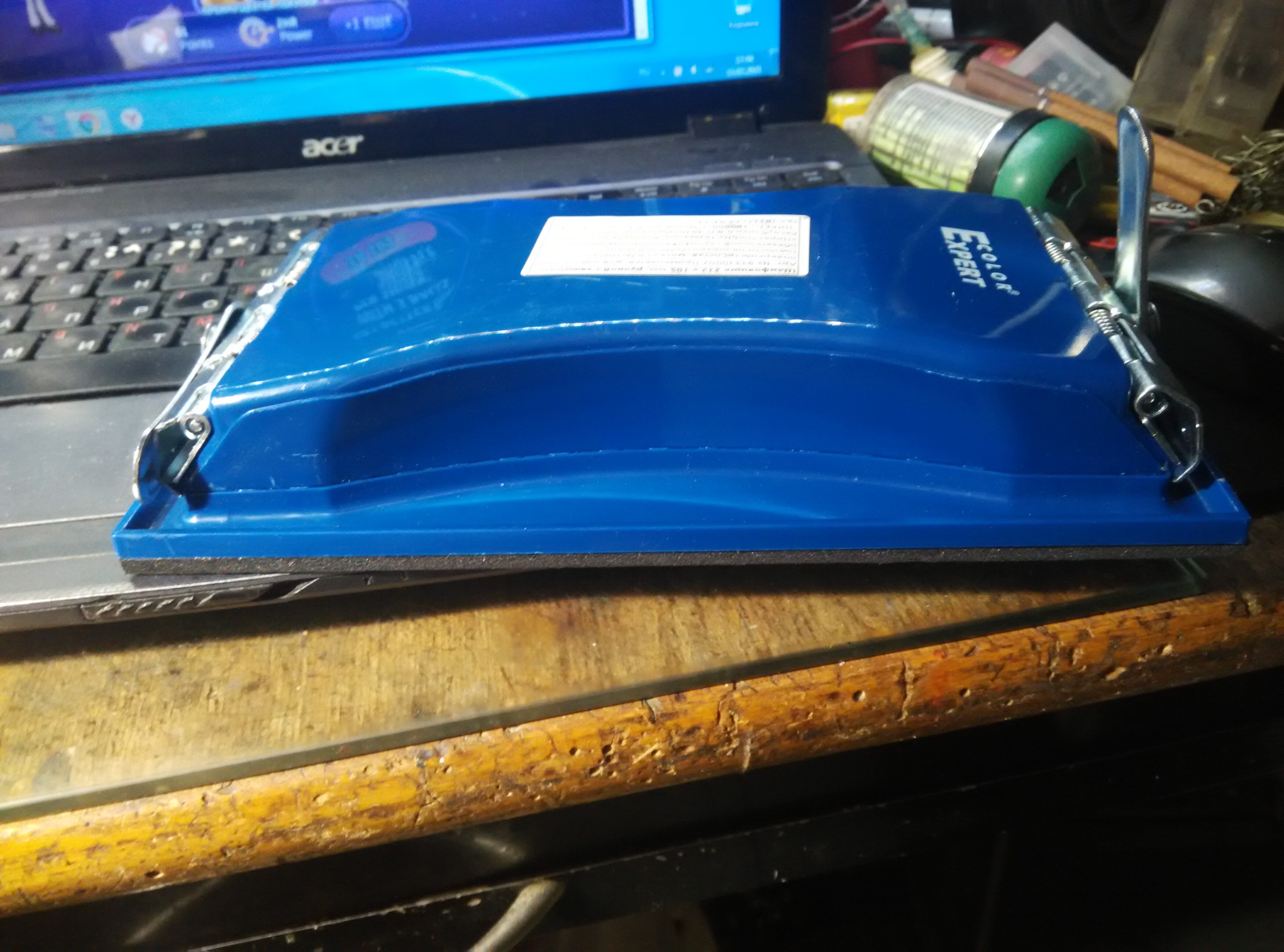 Если кто не в теме -это площадка под наждачку, для быстрого грубого ошкуривания больших площадей (потолок, стены) после шпаклёвки. Штука очень даже надобная- плотное прилегание под любым углом прижима (потому, что шарнирная).