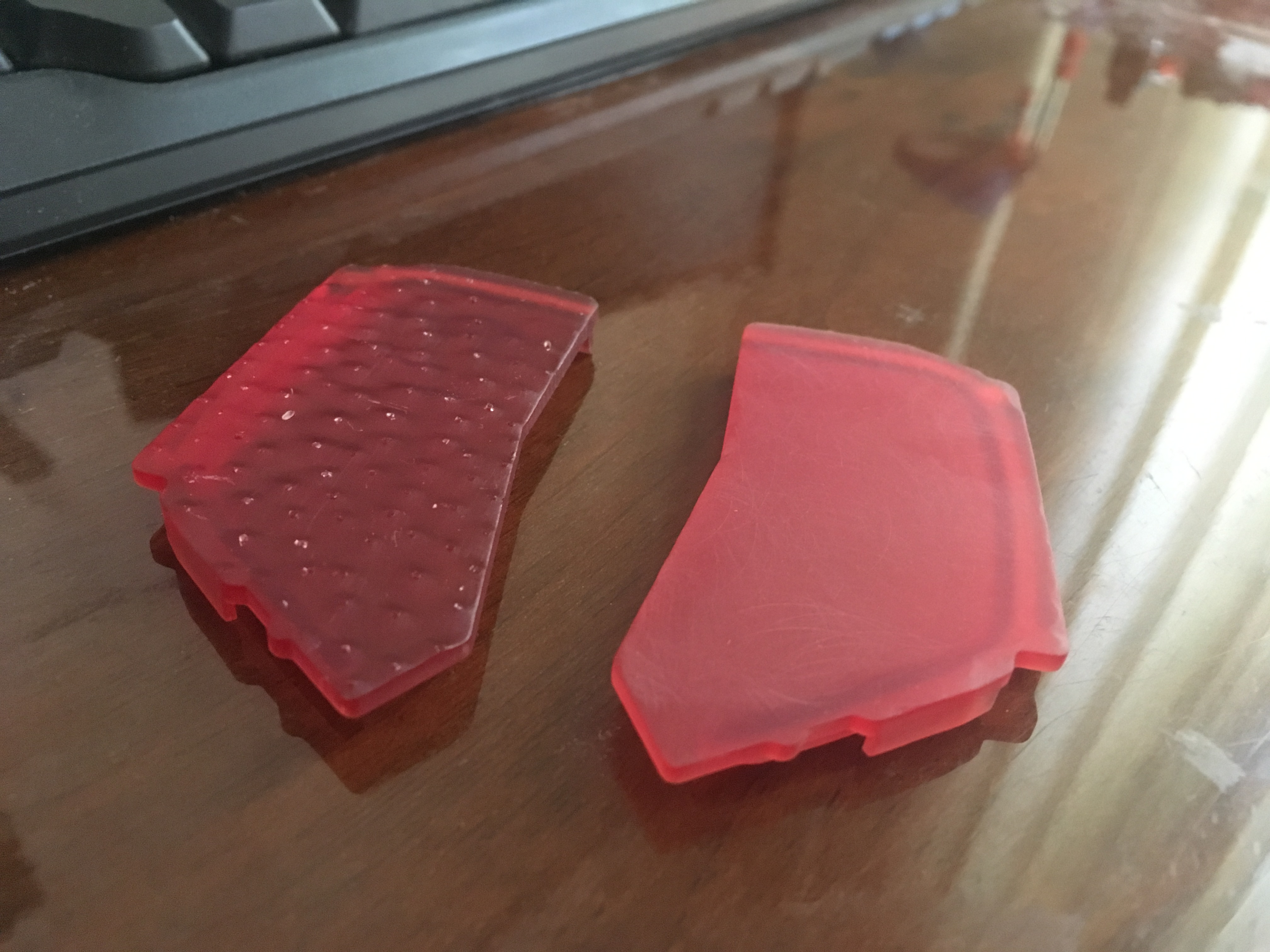 Немного выгнуло обе при дозасветке в ногтевой камере (2 минуты), впрочем не критично. Что интересно, выгнуло вдоль длинной стороны, хотя по идее выступы должны выступать ребрами жесткости. На будущее: сделать дополнительные ребра, конструктив позволяет.