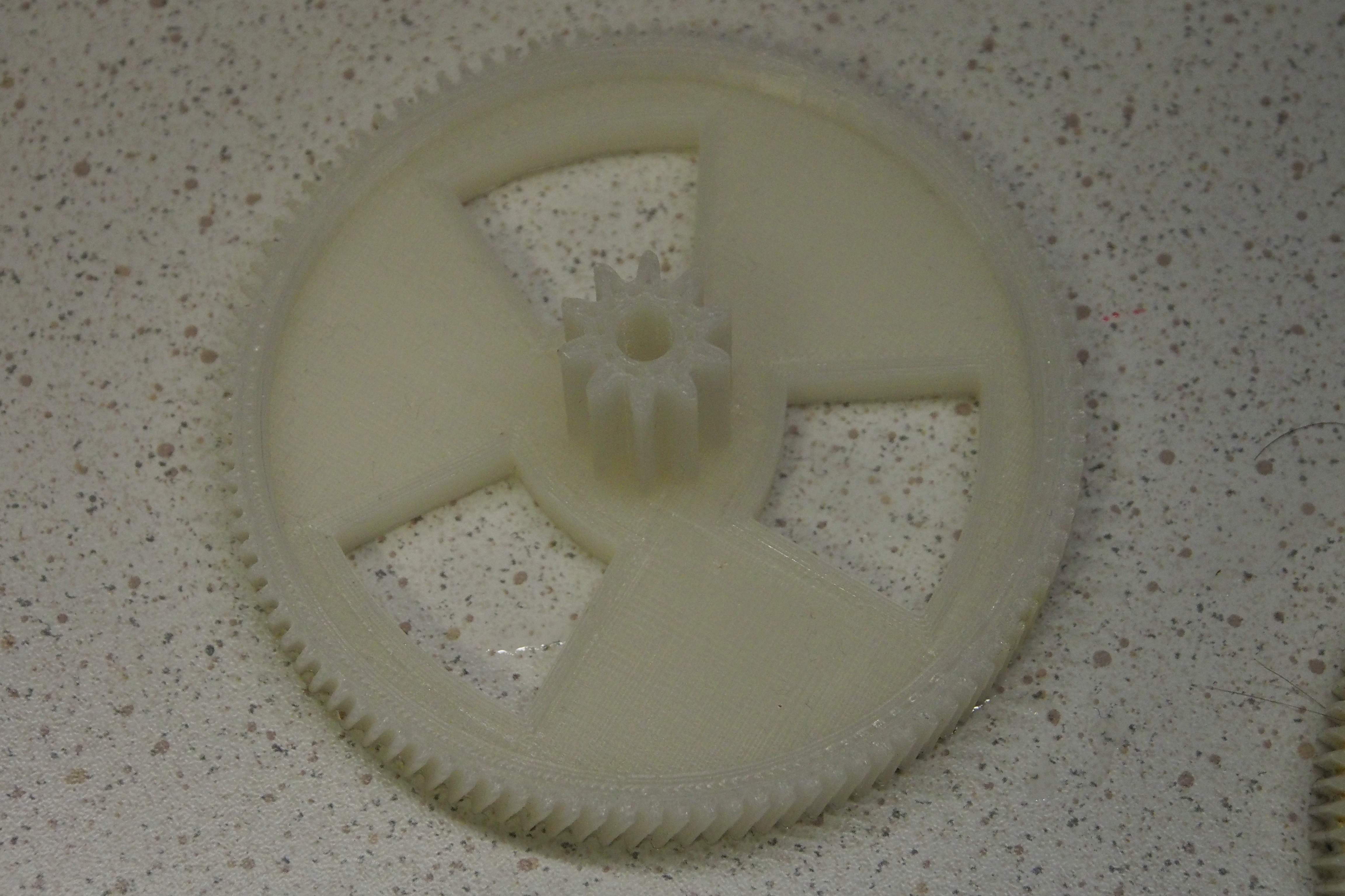Поэтому новую шестерню печатаем с запасов и учетом усадки. Ставим диаметр 100мм, после печати шестерня усаживается до 98,5 мм. Оригинал диаметром 98 мм. Вот такая занимательная арифметика.В следующий раз покажу интересную шестерню из типографского оборудования, где одна шестерная отлита поверх второй. Странно звучит, не так ли?