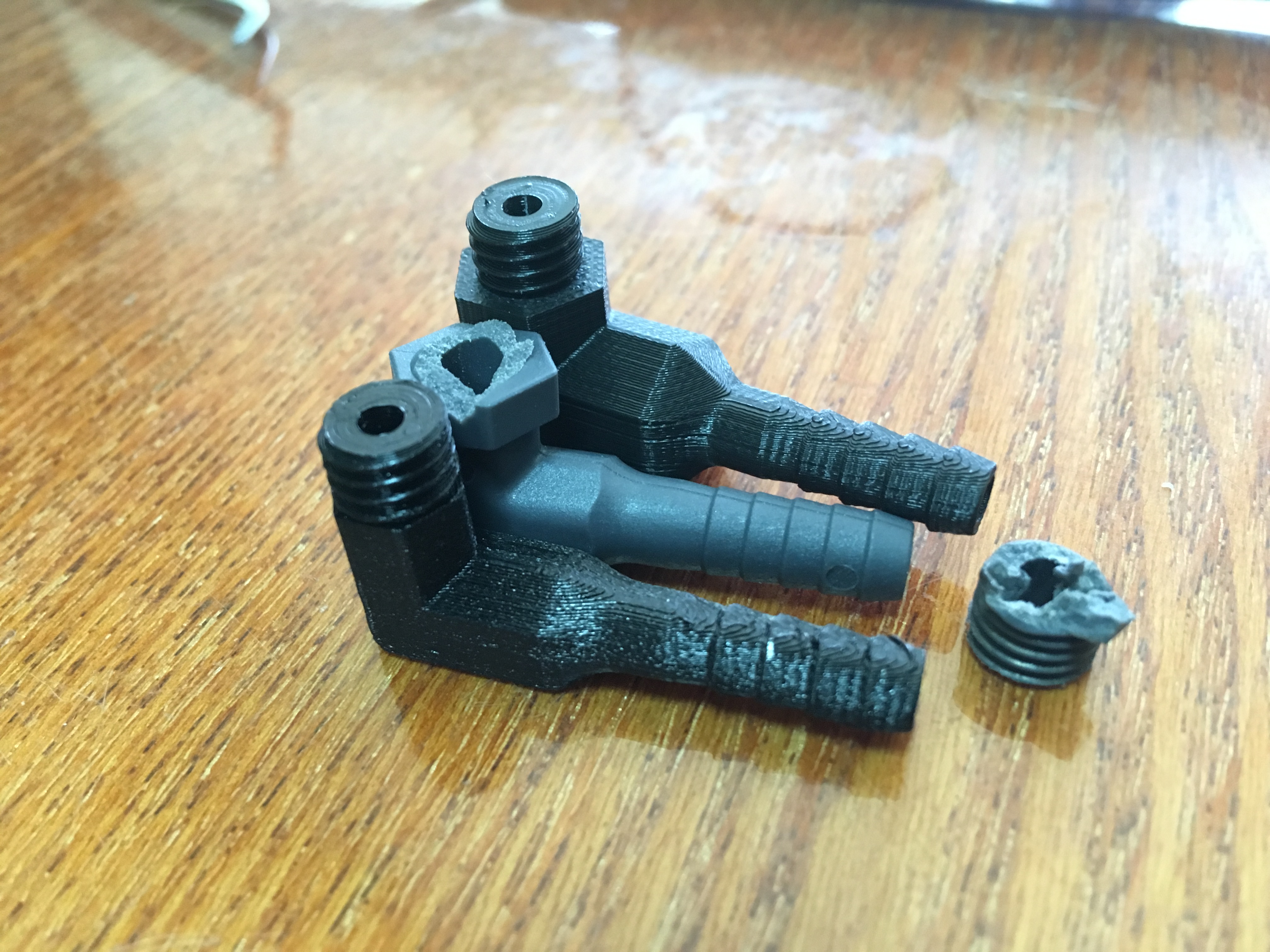 Печатал вместе с резьбой М8х1,75 слоем 0,1 одну ПЛА для пробы, одну ПЕТджи. Всё подошло без допиливаний - снял со стола оторвал поддержки, прикрутил.