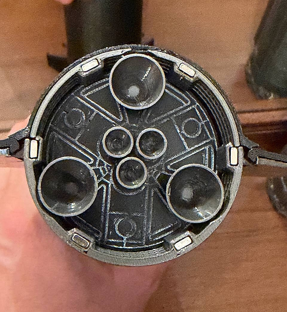 Крепление КК к бустеру сделано на магнитах. Магниты небольшие (10х5х2 мм), не удержат детали при резких движениях при переноске модели, но позволяют правильно позиционировать КК относительно бустера, и избавляют от некопийных скрепляющих детали штырей.